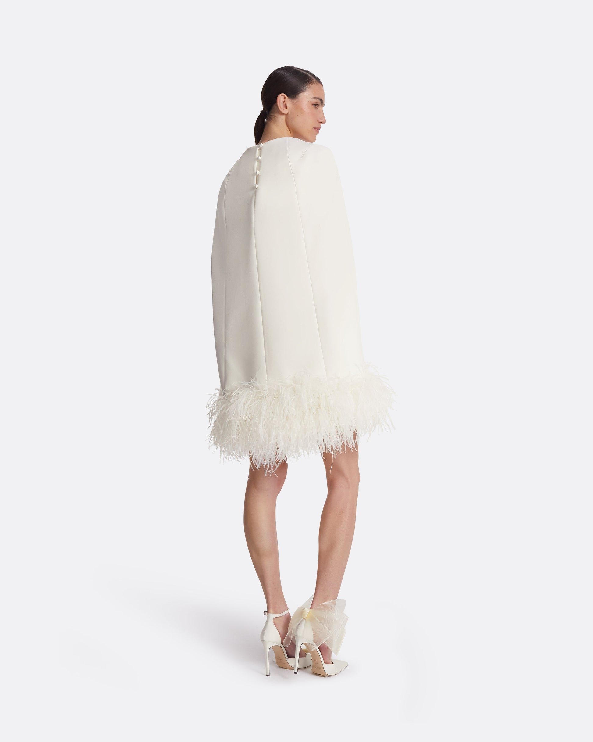 Caped mini dress with split sleeve in ivory Heavy Crepe and Ostrich Feathers.