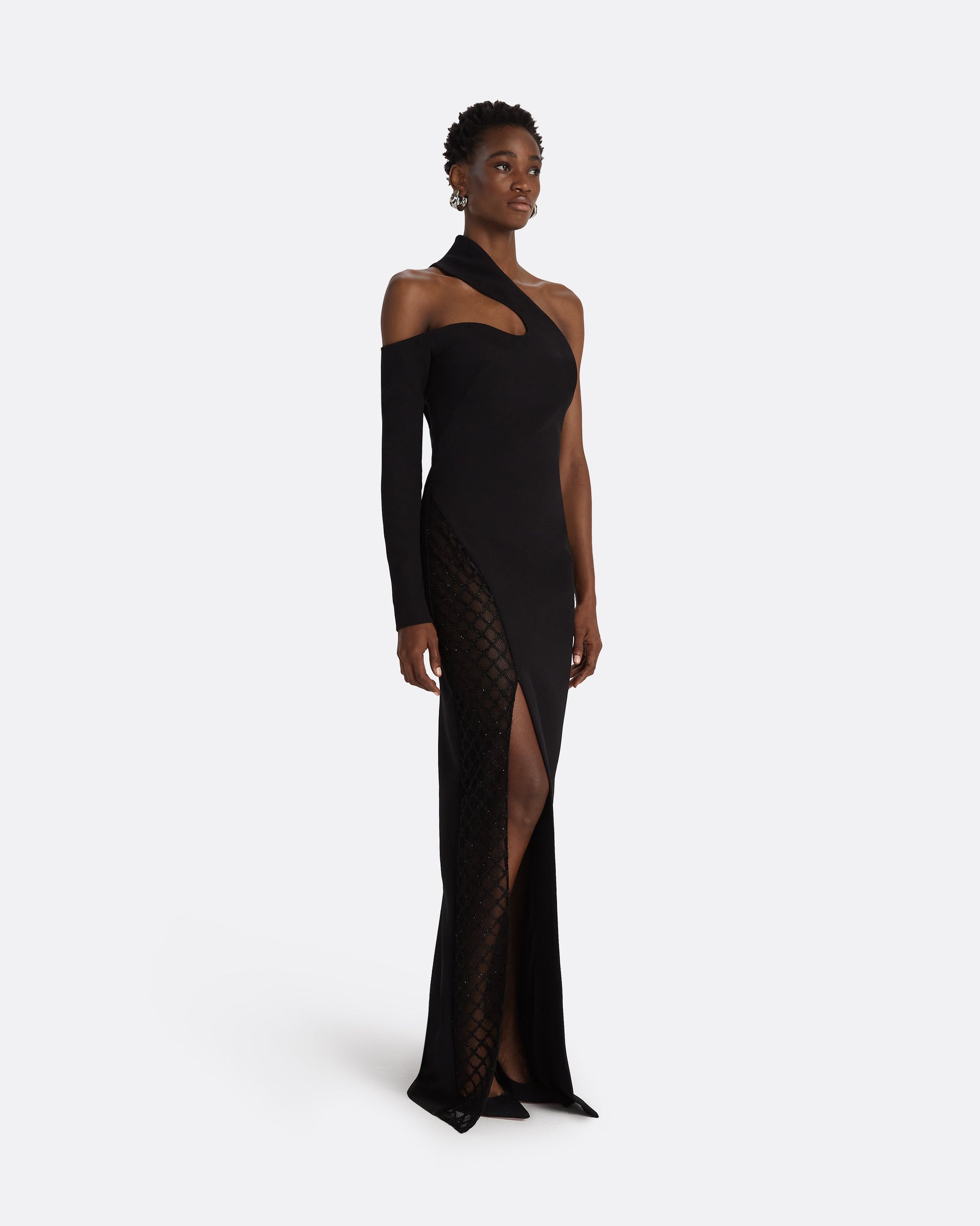 Flattering column gown with asymmetric neckline in black Heavy Crepe and Honeycomb Lace.