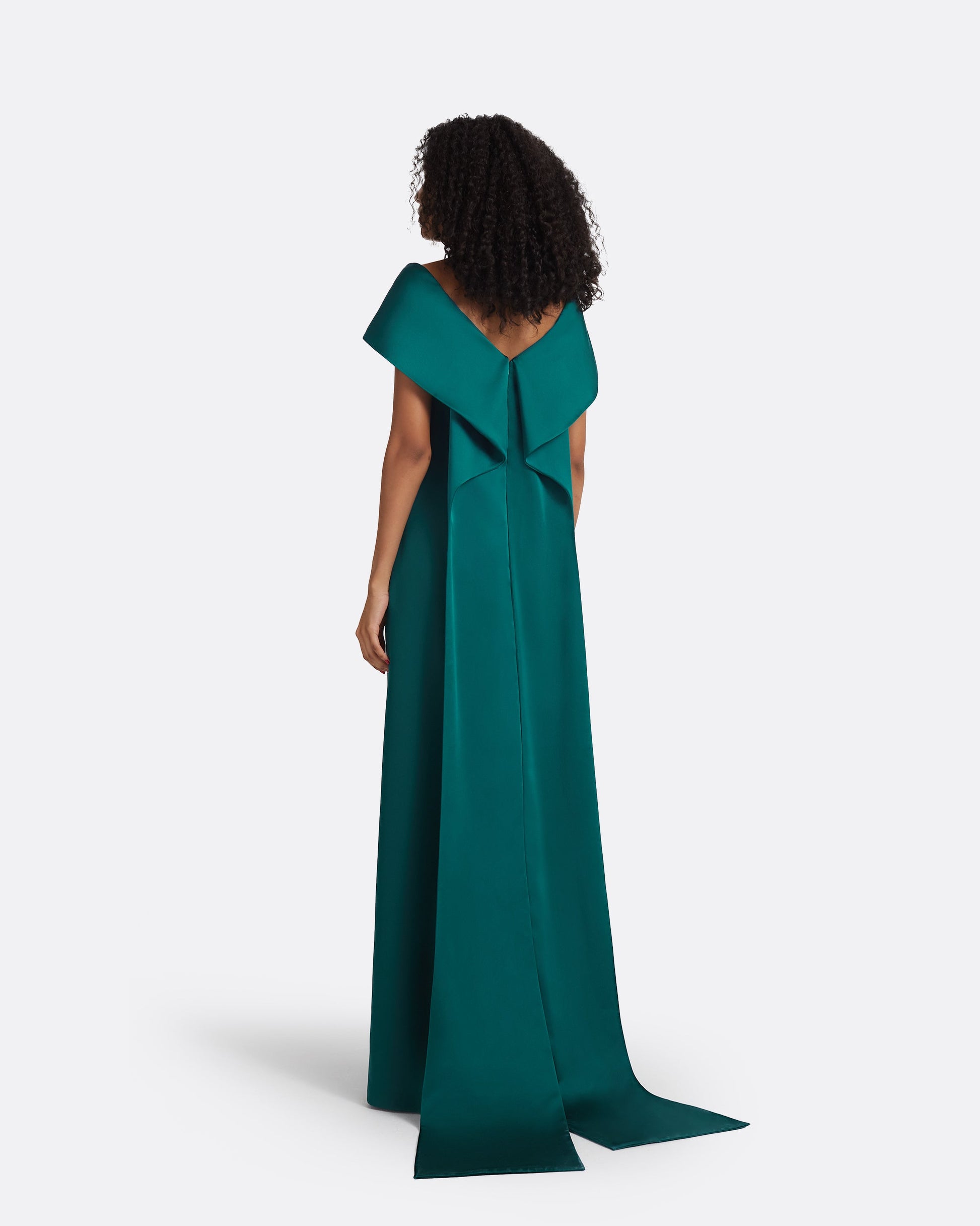 A line gown with relaxed waist and back drape in alpine green Heavy Crepe and Shine Satin Stretch.