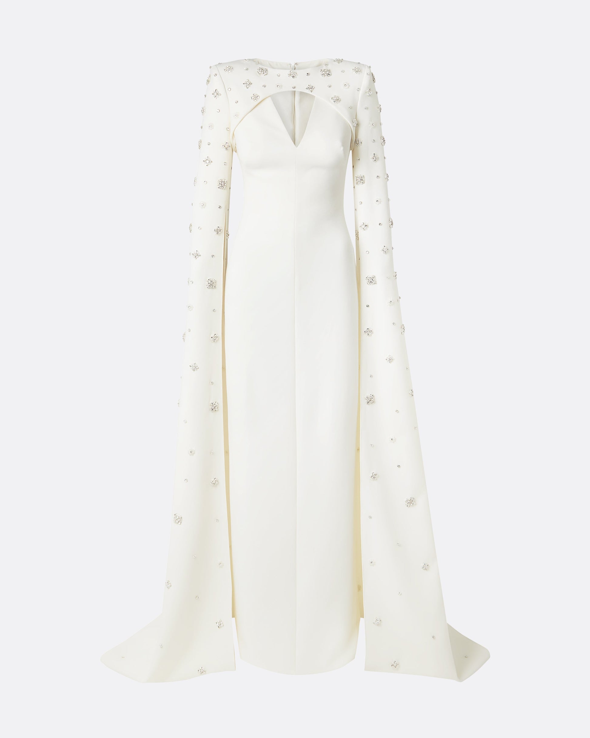 Tailored gown with full sleeve and cut out detail in ivory Heavy Crepe and Folius embroidery.