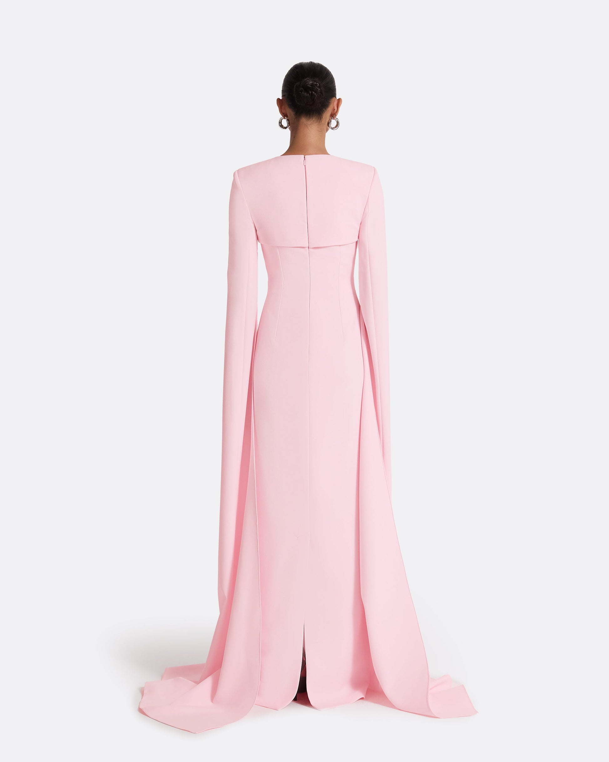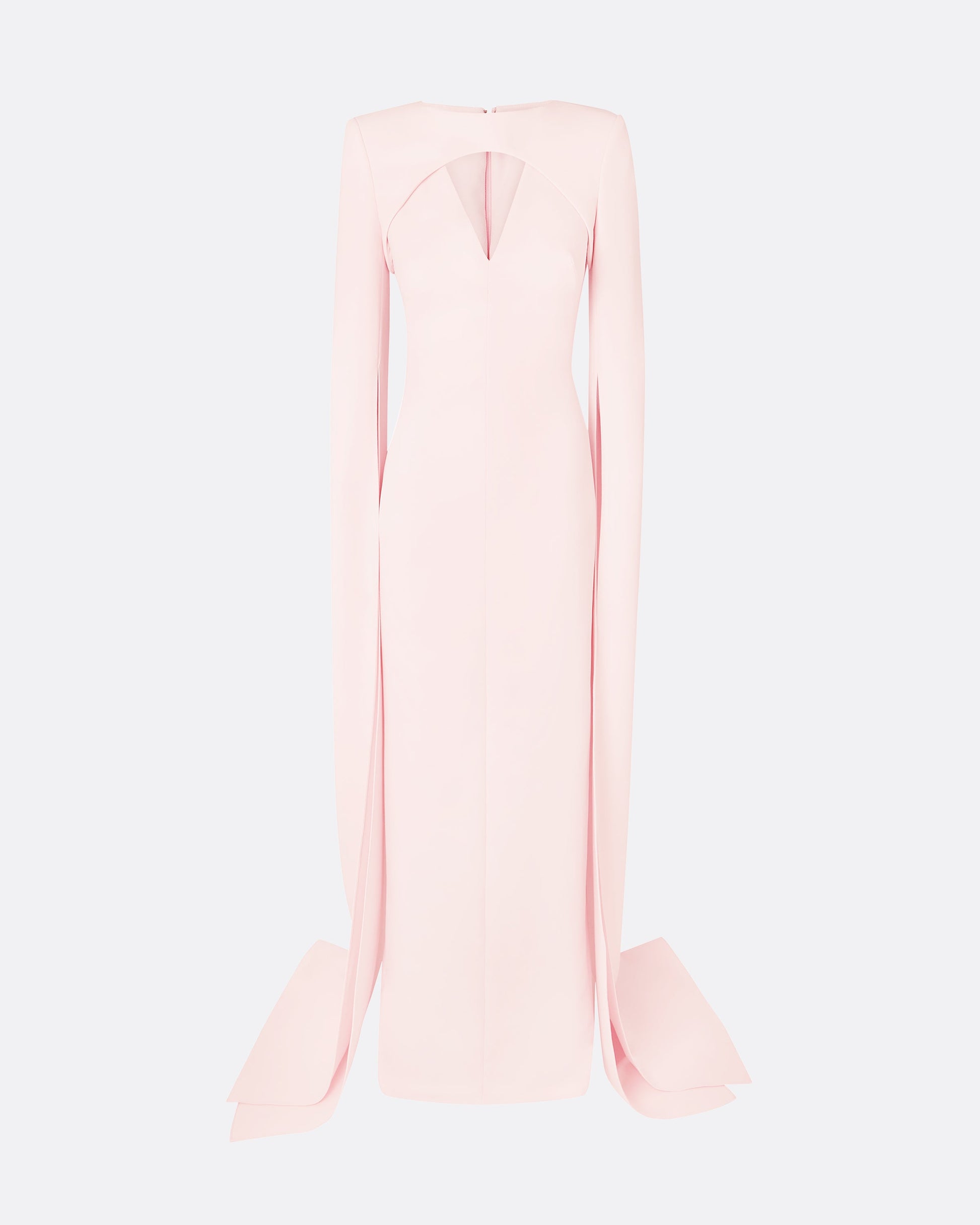 Tailored gown with full sleeve and cut out detail in peony blush Heavy Crepe.
