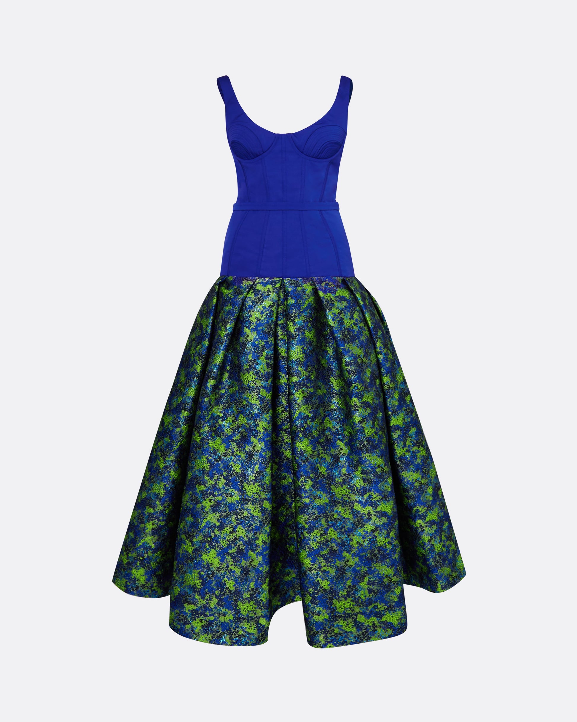 Dramatic, scoop neck gown with seam and cup detail in terra Paloma Jacquard and marrakech Manhattan Plain.