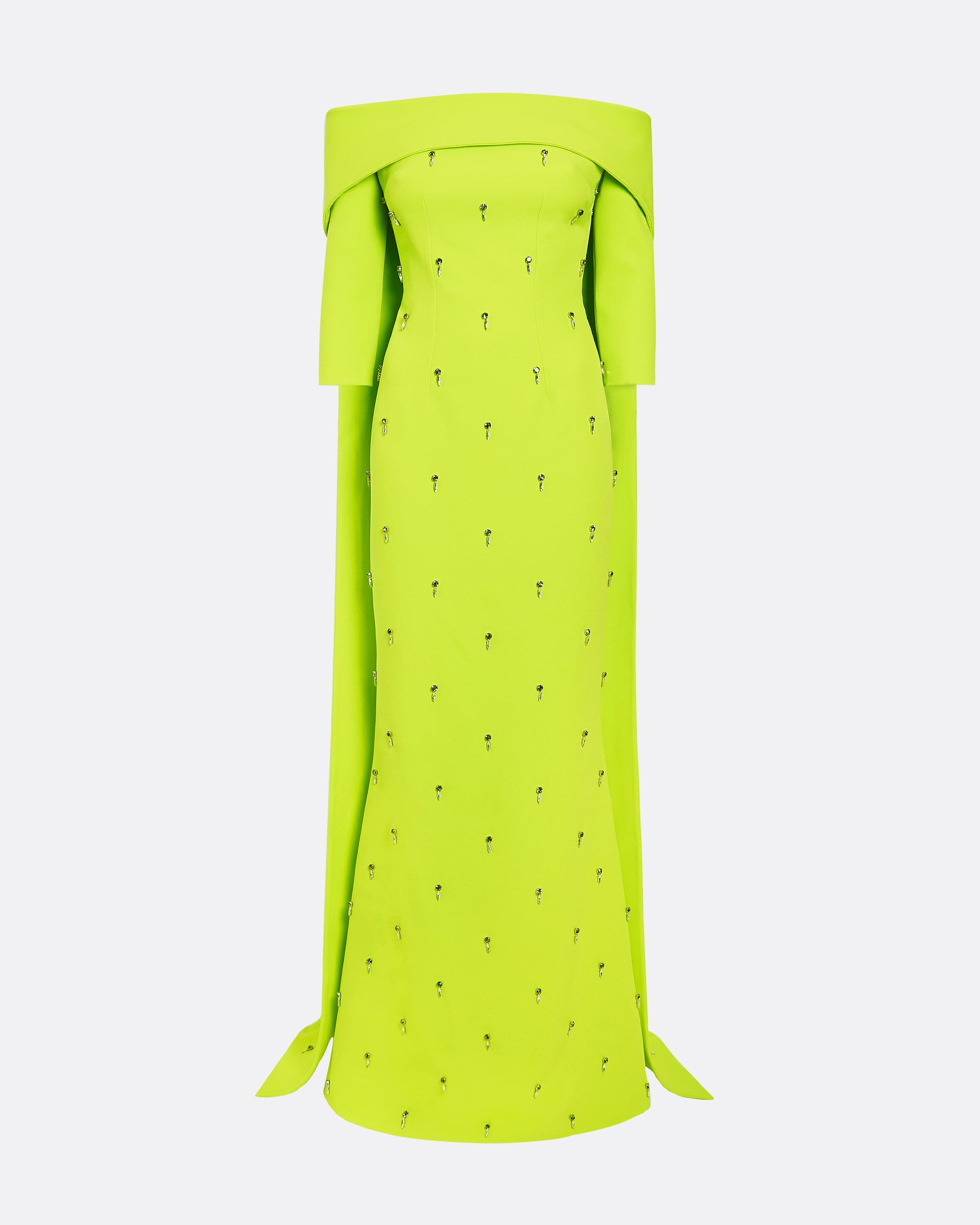 Strapless long dress with fishtail skirt & off the shoulder topper with trail long back and straight sleeve, in tendershoots and smoke/crystal Crystal Grid embroidery.