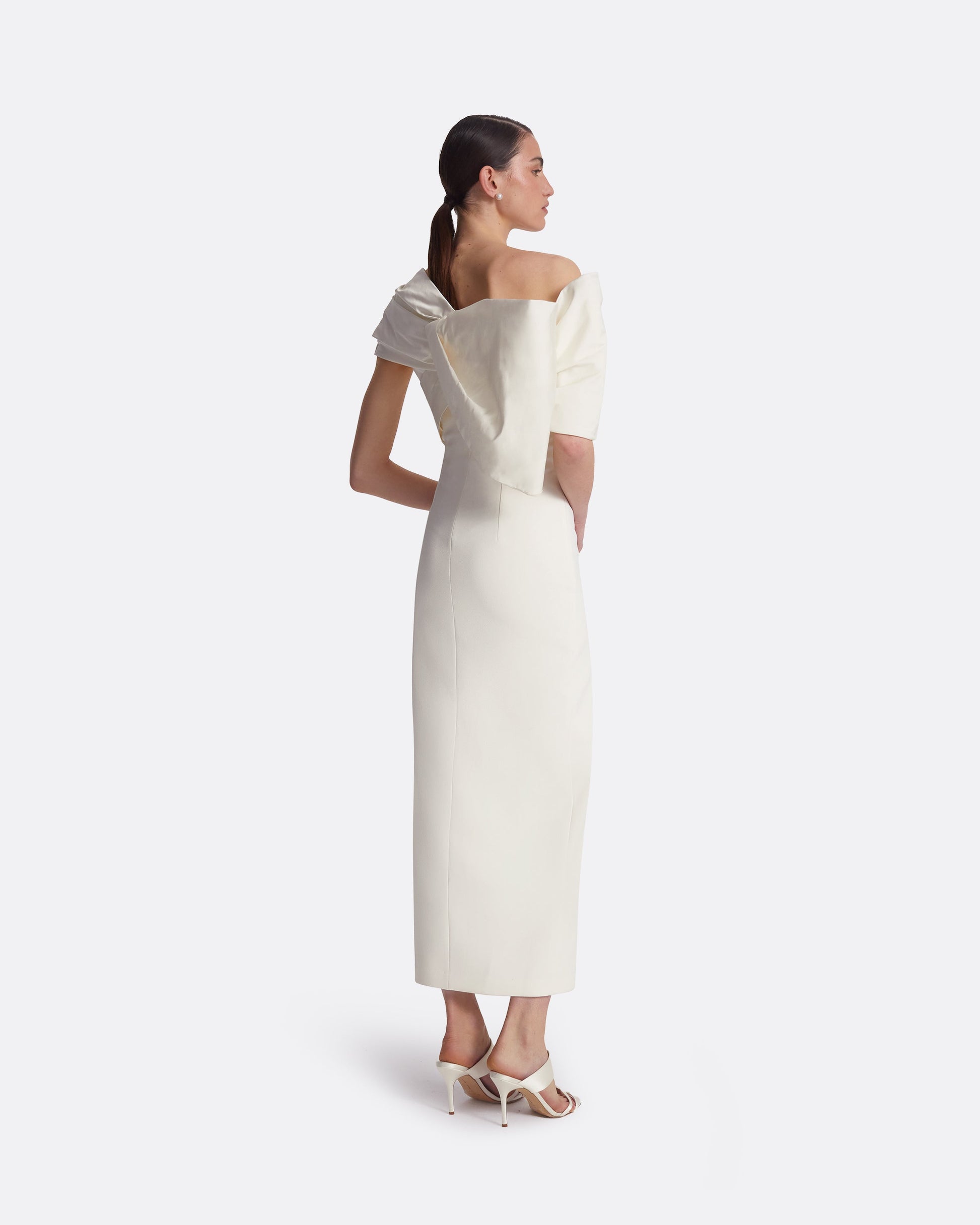 Cocktail dress with front slit and abstract bow drape in ivory on ivory Heavy Crepe and Faille with pearl Carnation Trim embroidery.