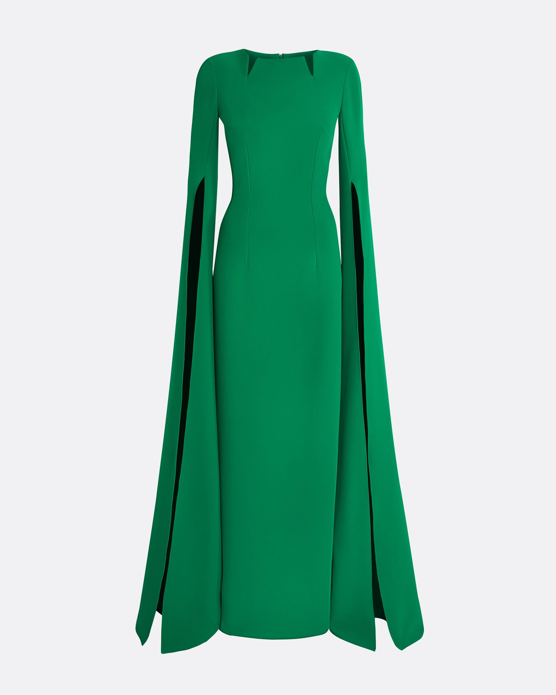 Slashed neck long dress with floor length sleeve in emerald heavy crepe.