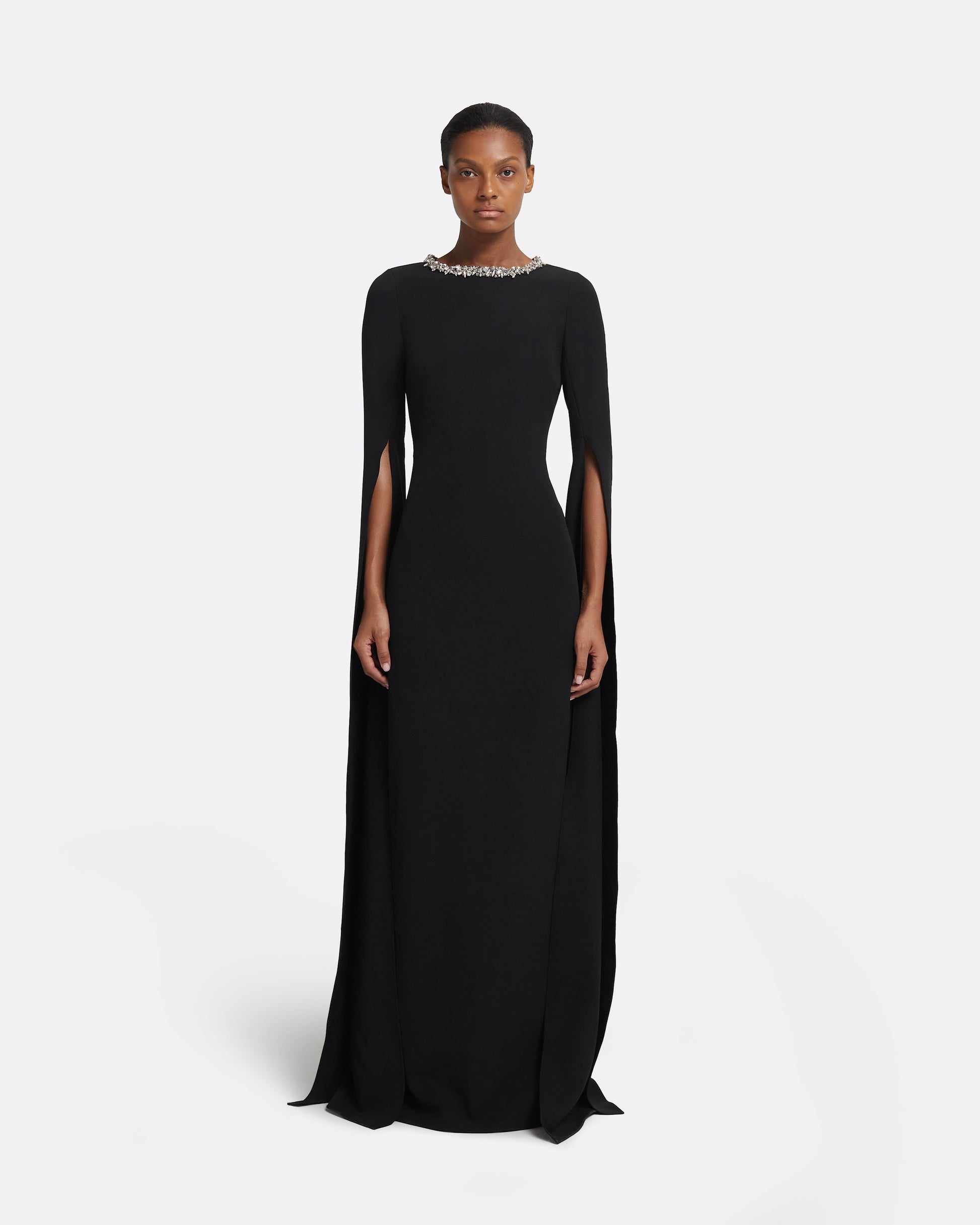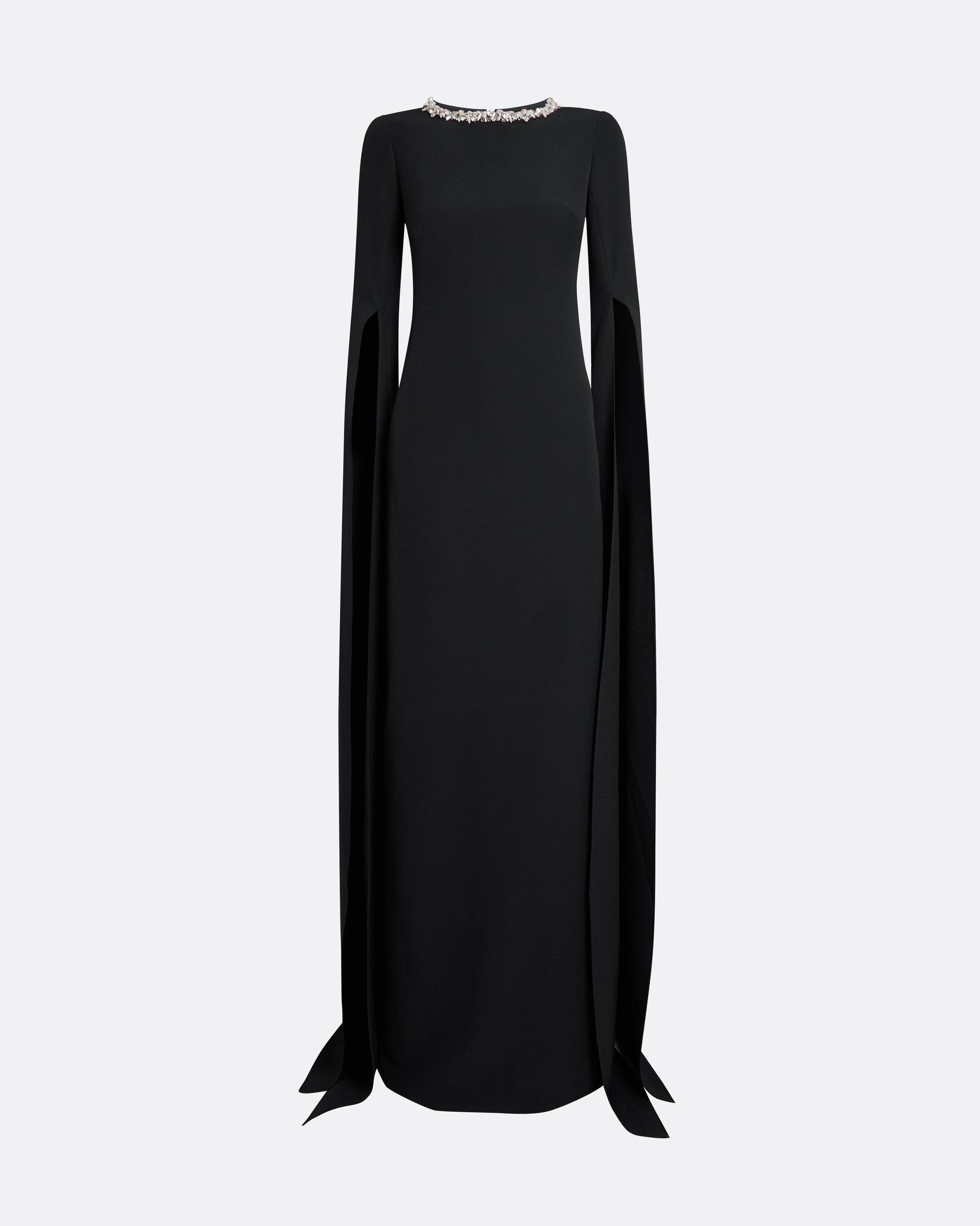 Gown with boat neck and split sleeve in black Heavy Crepe with smoke/crystal Crystal Trim B embroidery.