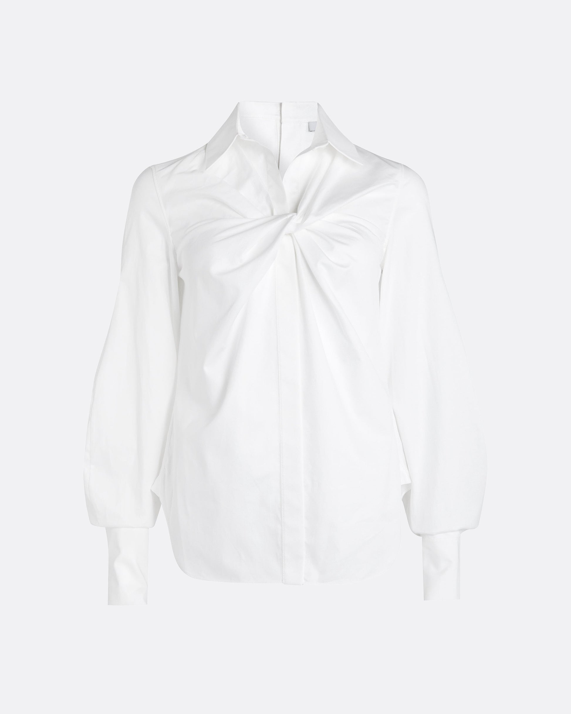 Long sleeve shirt with front tie knot drape in ivory Cotton Poplin.