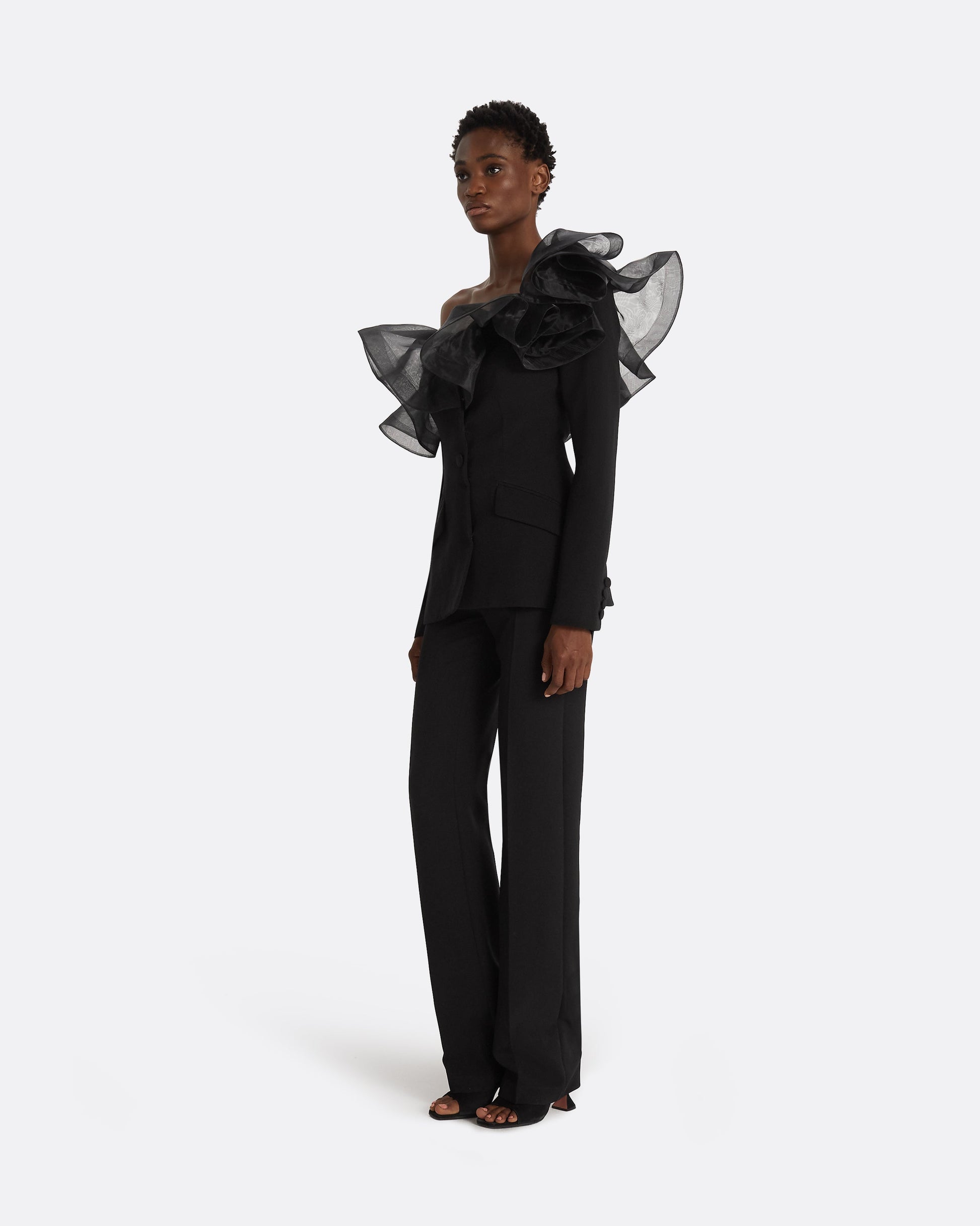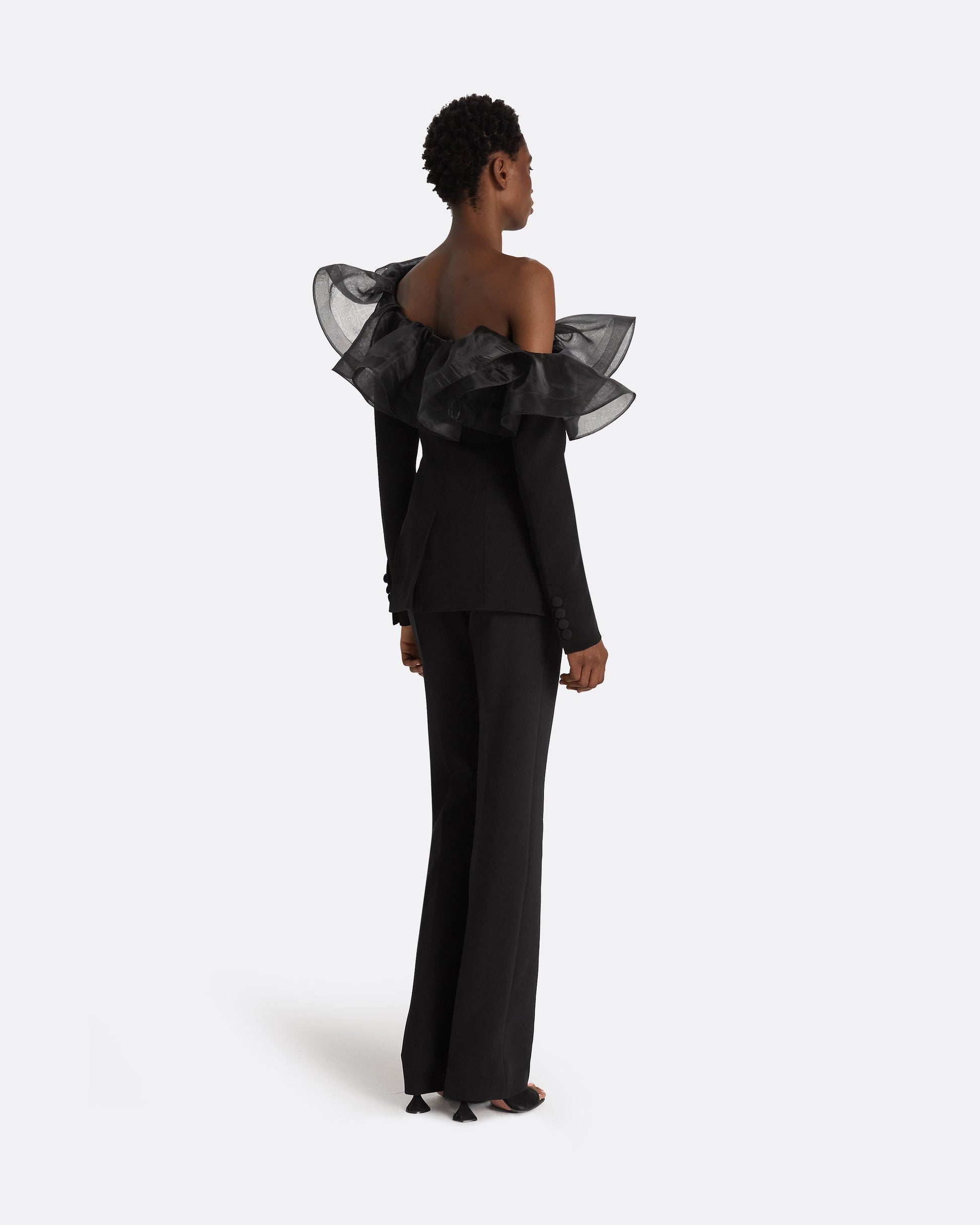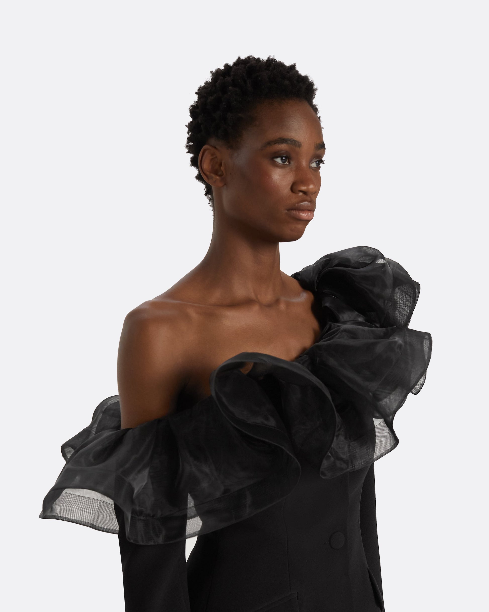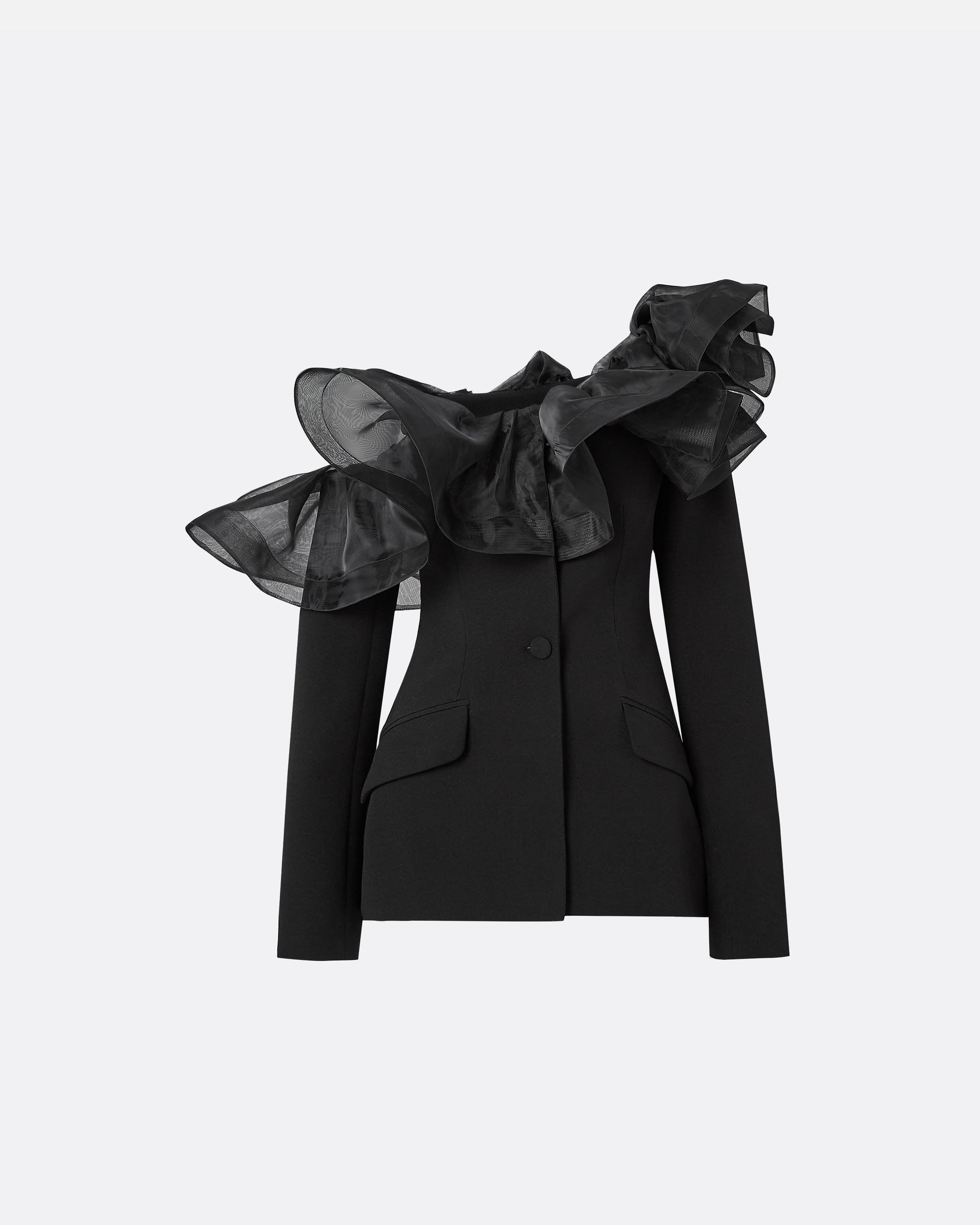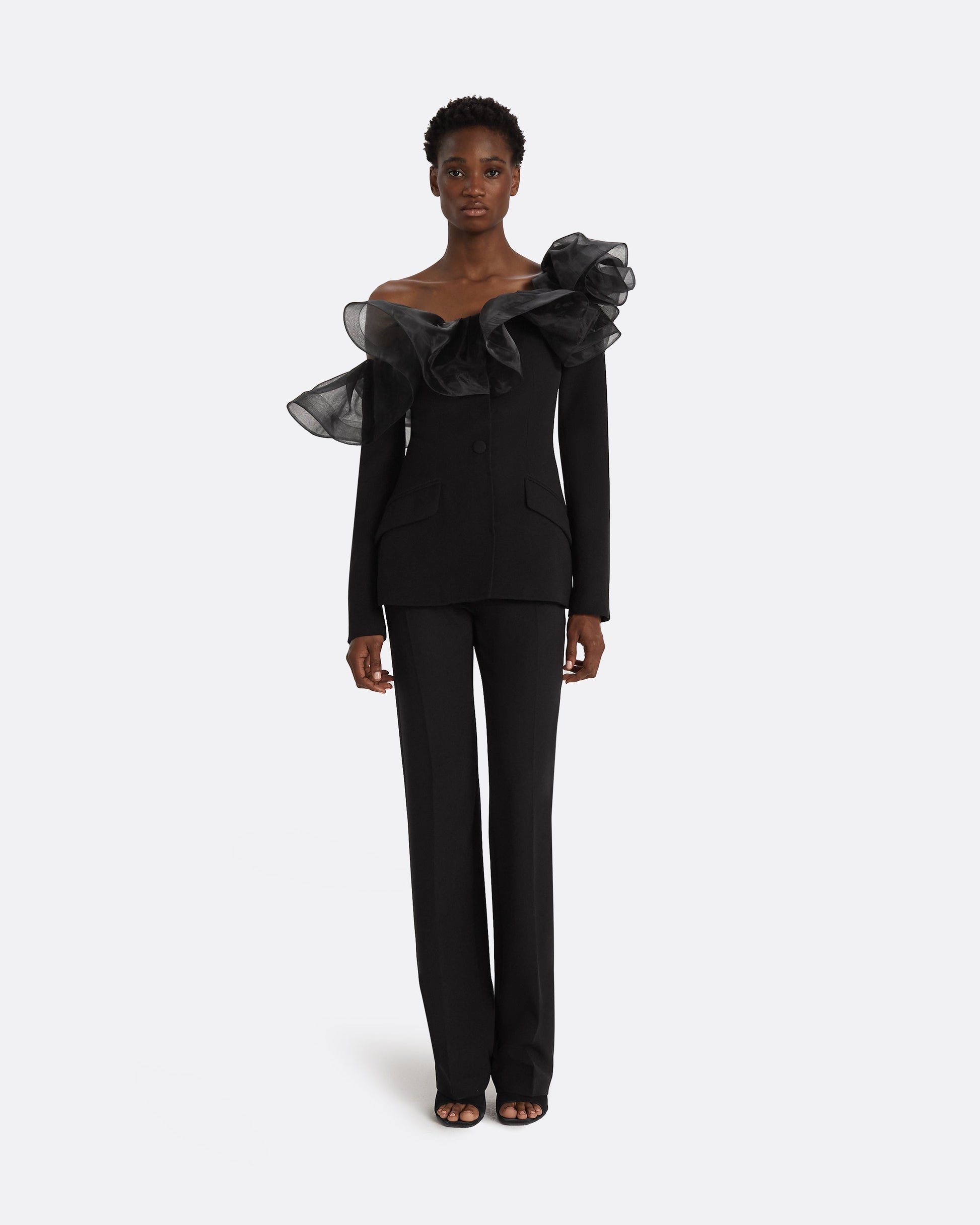 Tailored jacket with cascading draped detail in black Glass Organza and Heavy Crepe.