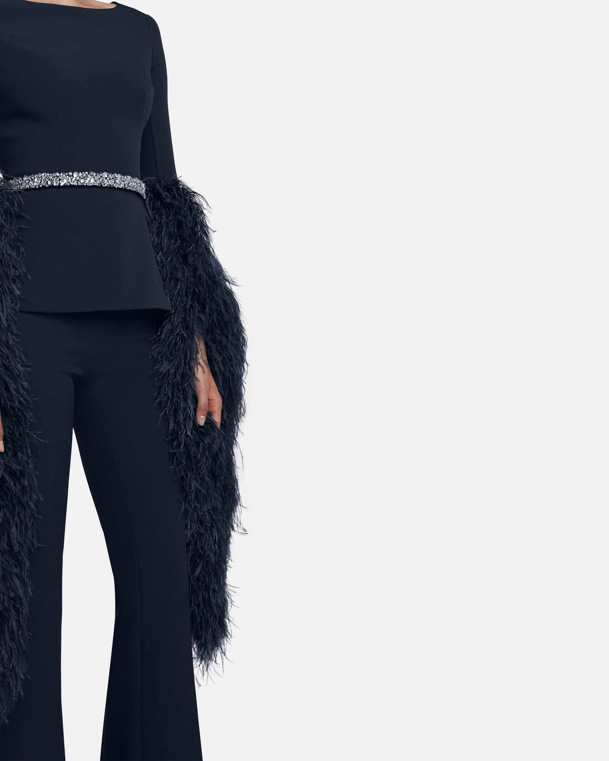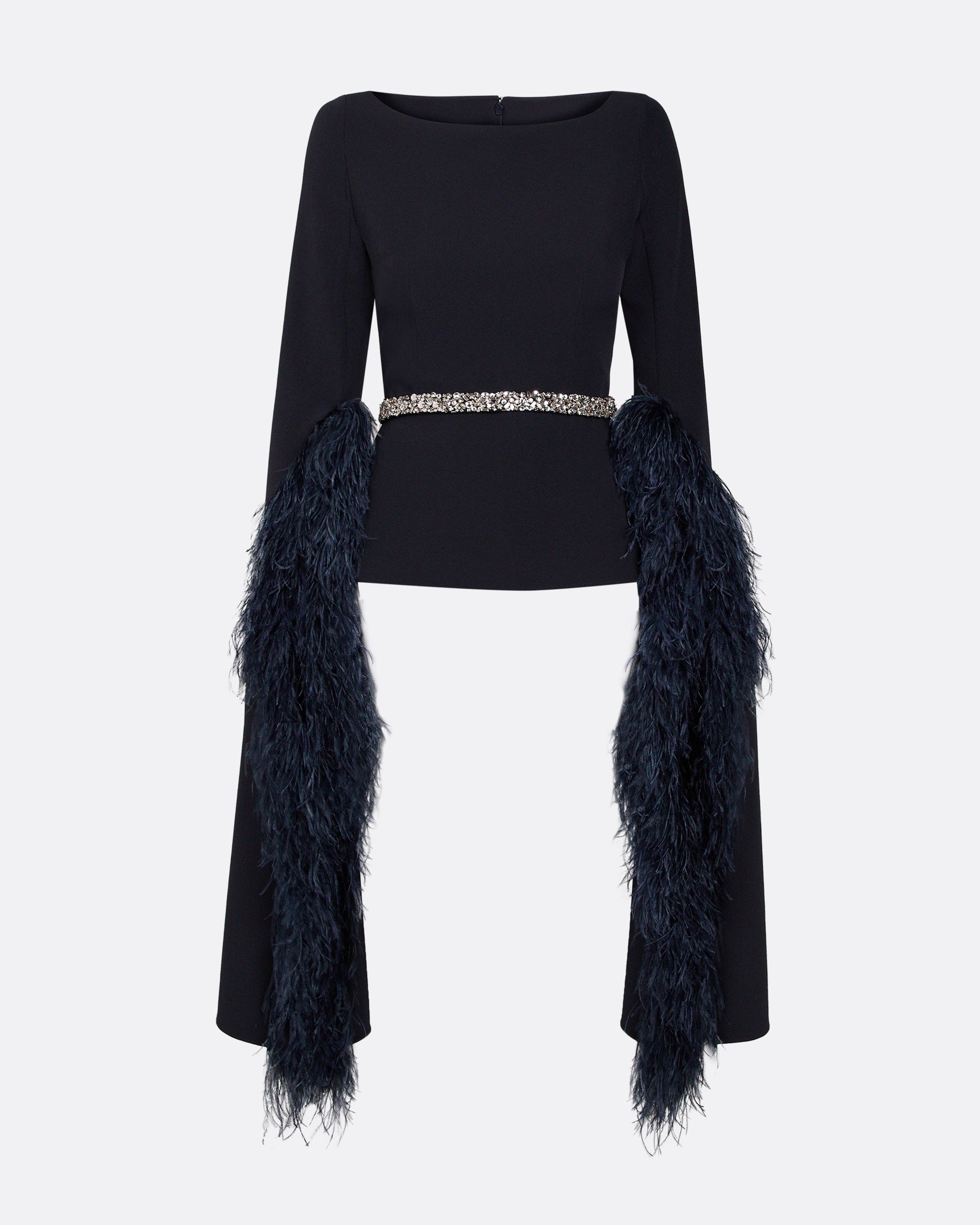 Boat neck top with elongated slit sleeves and statement feather trim in midnight navy.