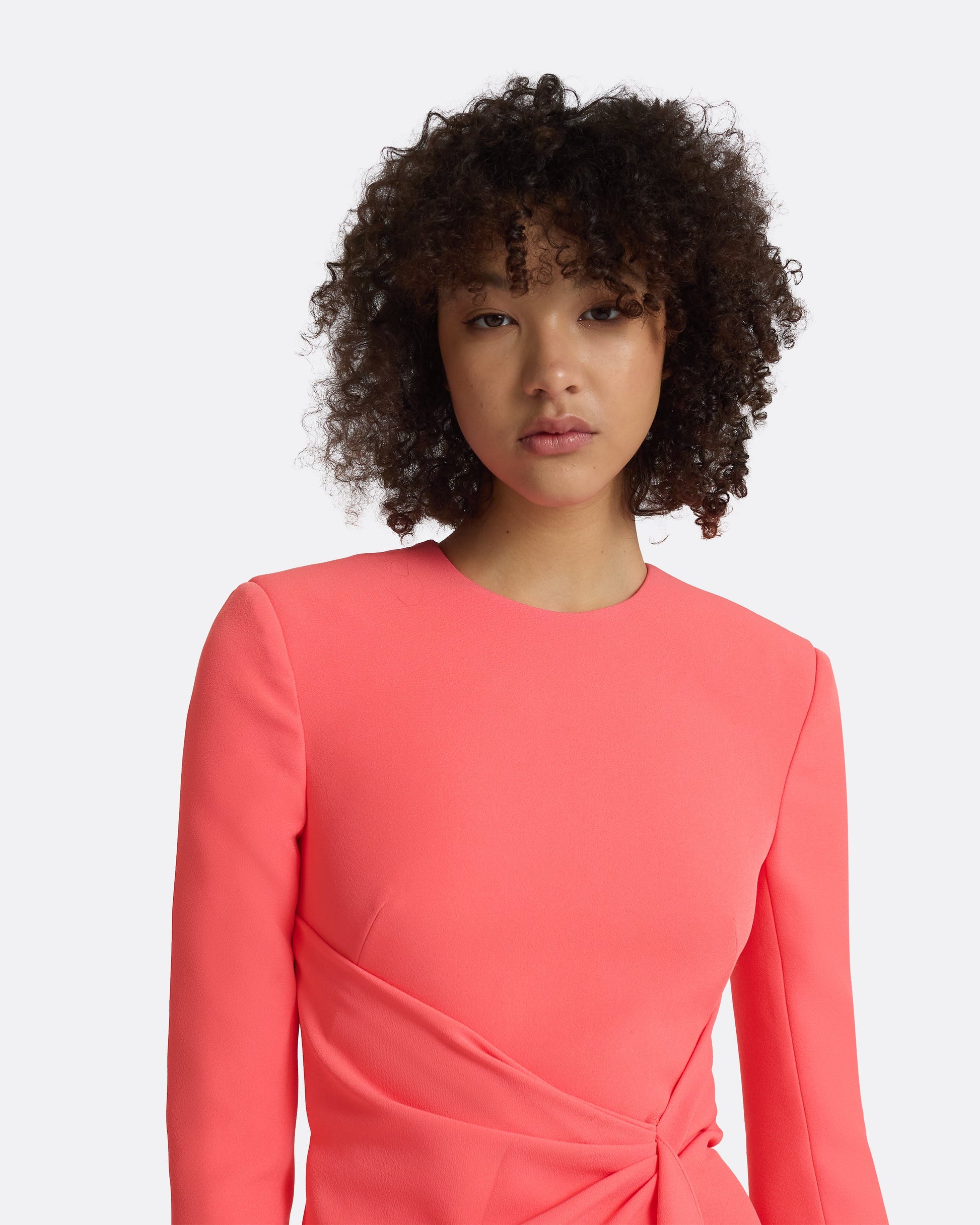 Ankle length gown with crew neck, long sleeves and flattering, pleated waist drape in mosaico Heavy Crepe.