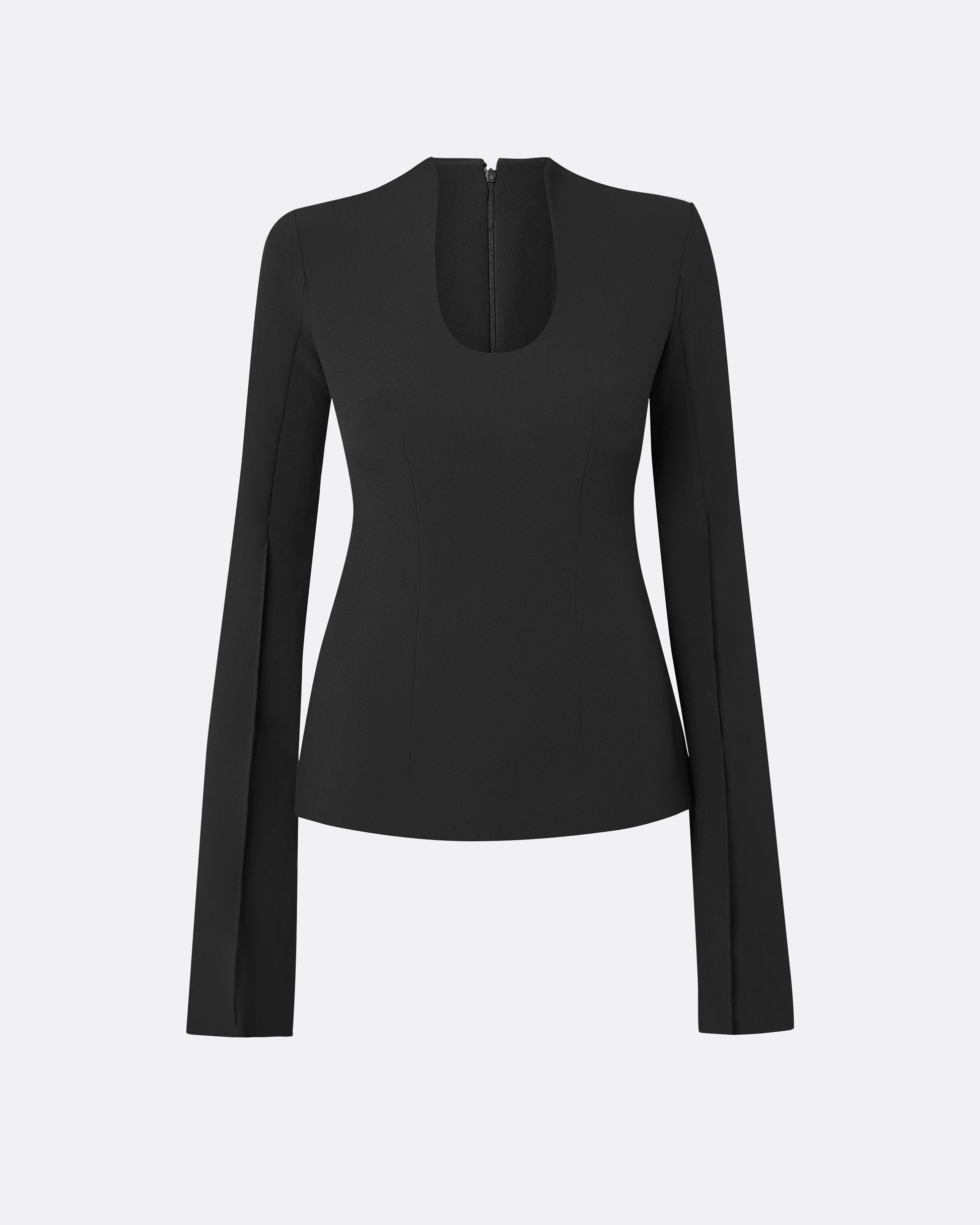 Top with slit sleeves and scooped out neck in black Heavy Crepe with gunmetal Mirror Disk embroidery.