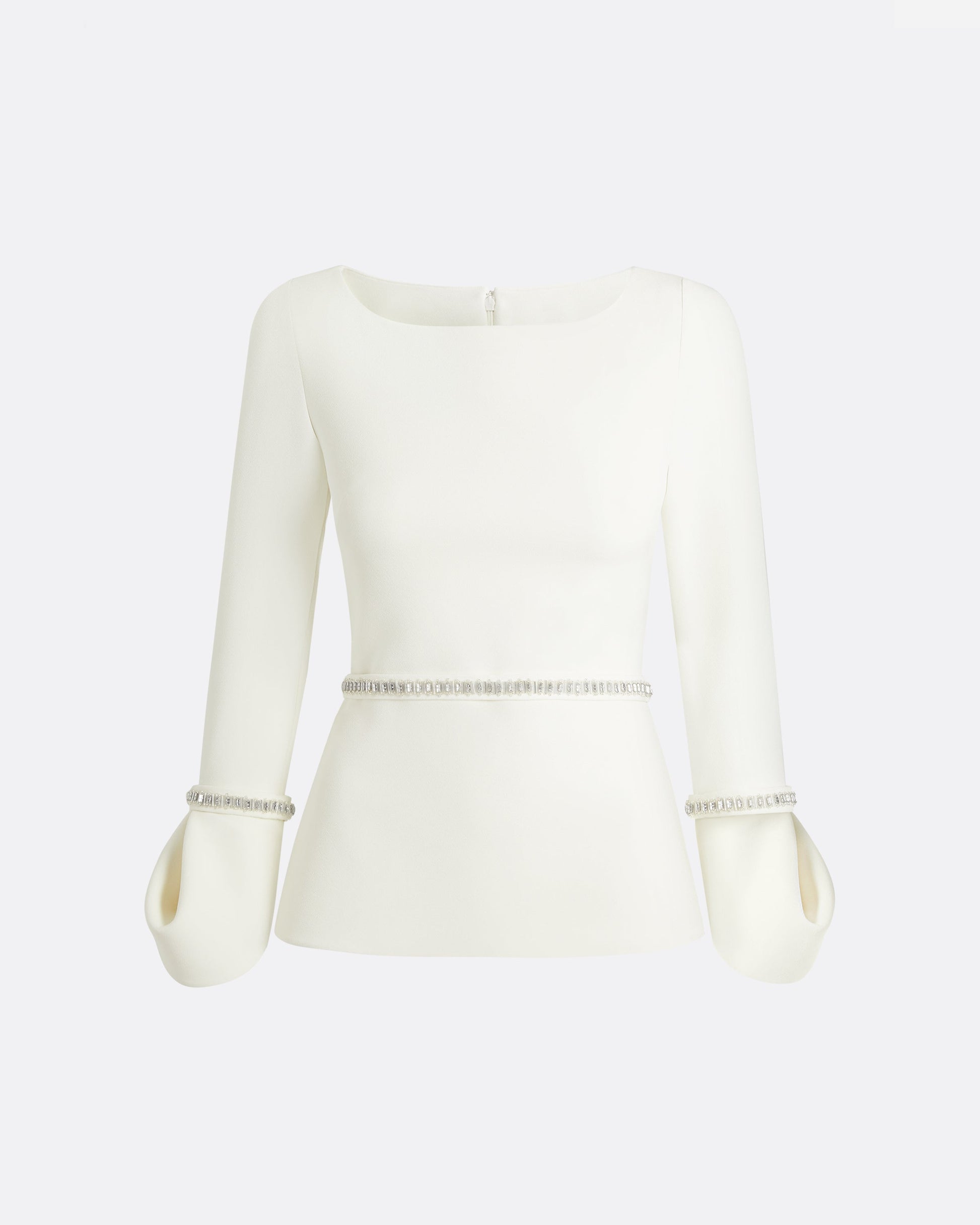 Boat neck, peplum top with tulip drape sleeve in ivory with crystal Jewel Ladder Trim.