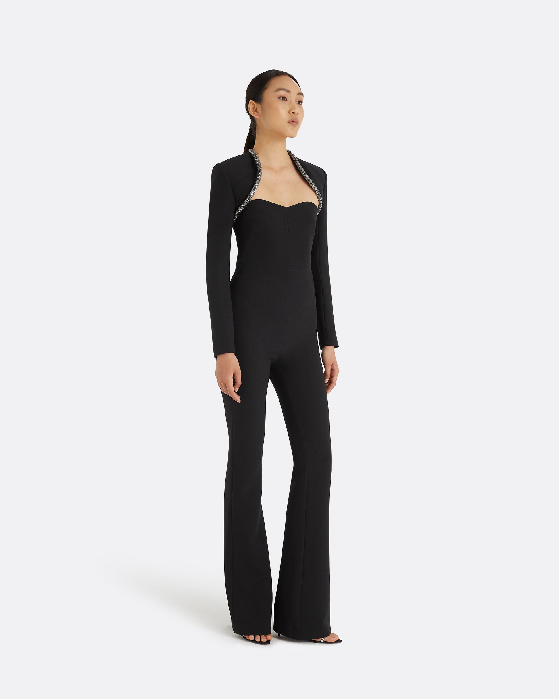 Long sleeved harness with curved neckline in black Heavy Crepe with Serpentine Trim embroidery. Sold with a bustier jumpsuit with semi-flare leg.