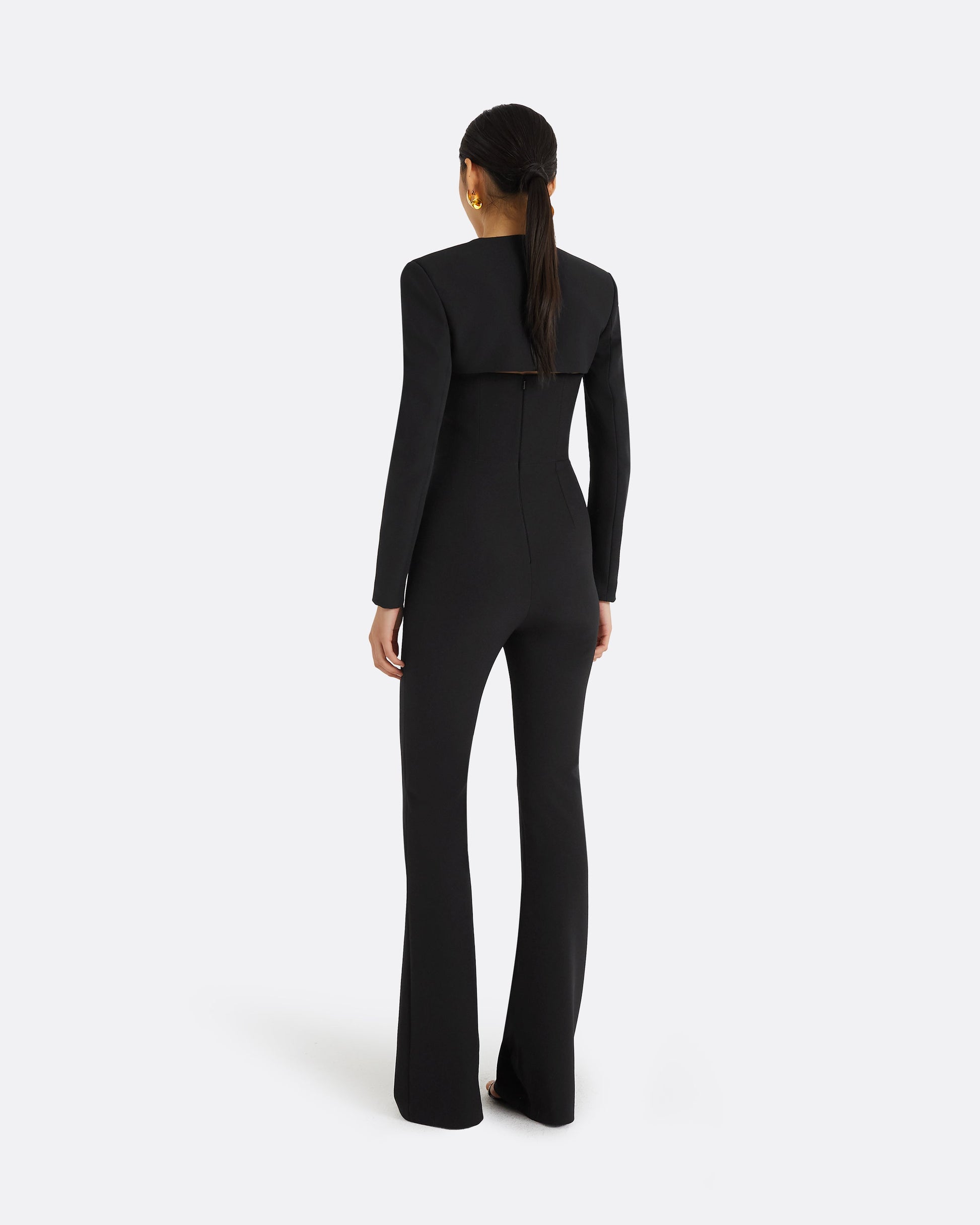 Long sleeved harness with curved neckline in black Heavy Crepe. Sold with a bustier jumpsuit with semi-flare leg.