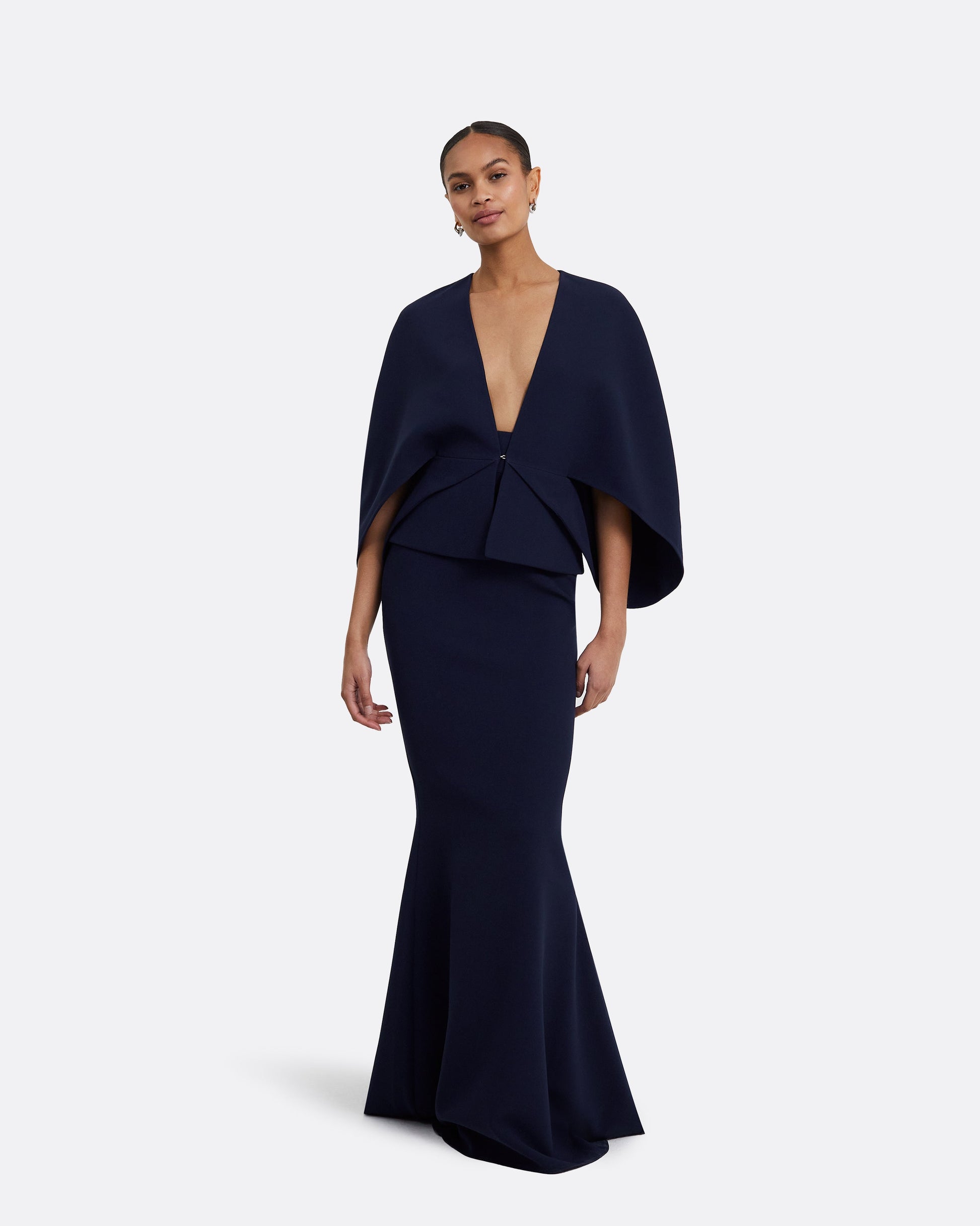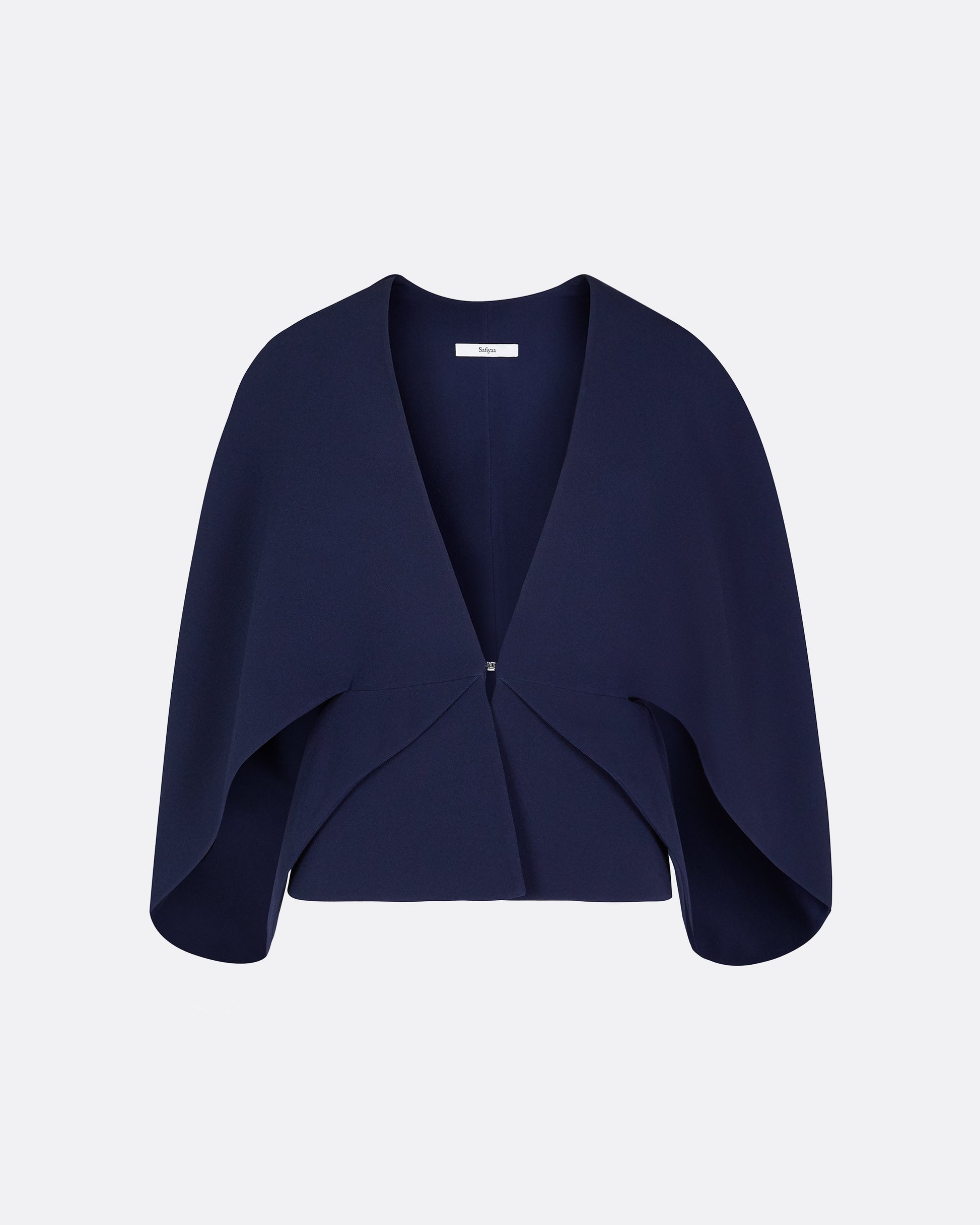 V-neck tulip cocoon jacket in maritime blue.