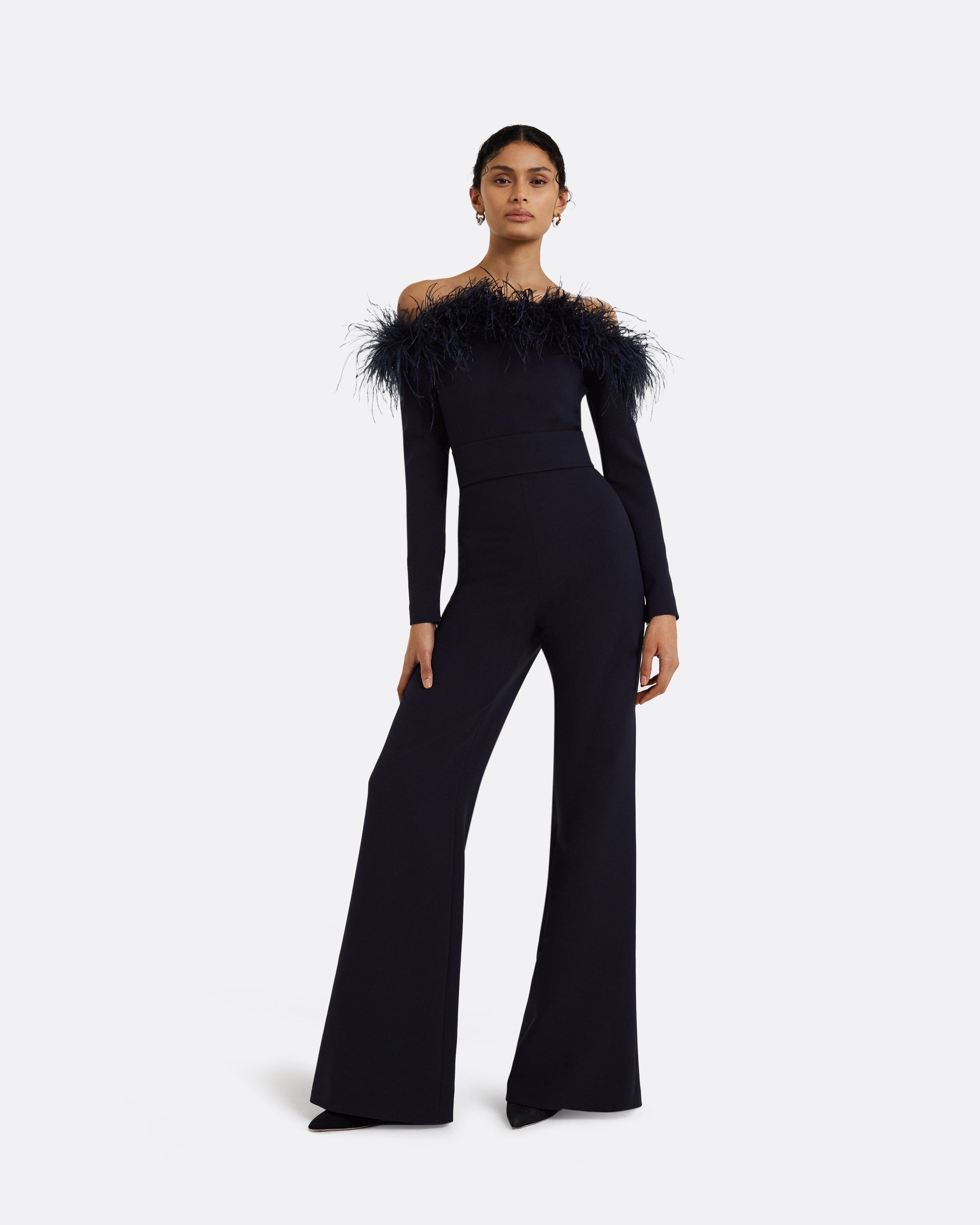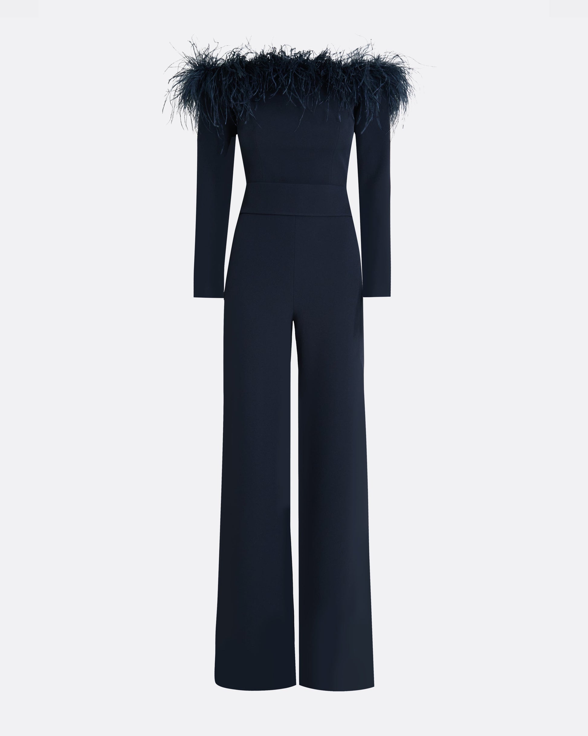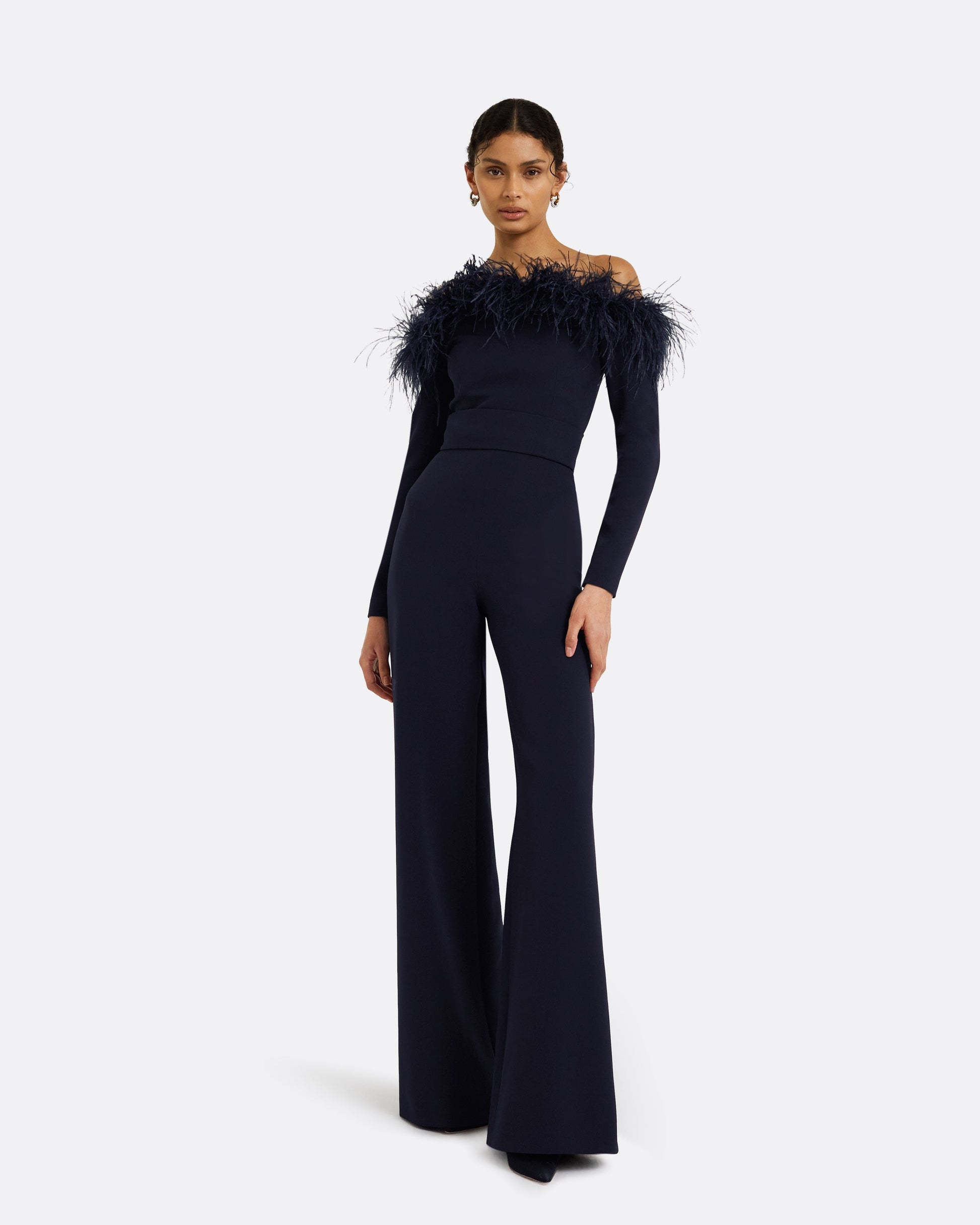 Long sleeved, off the shoulder, wide leg jumpsuit with statement feather trim in midnight navy.