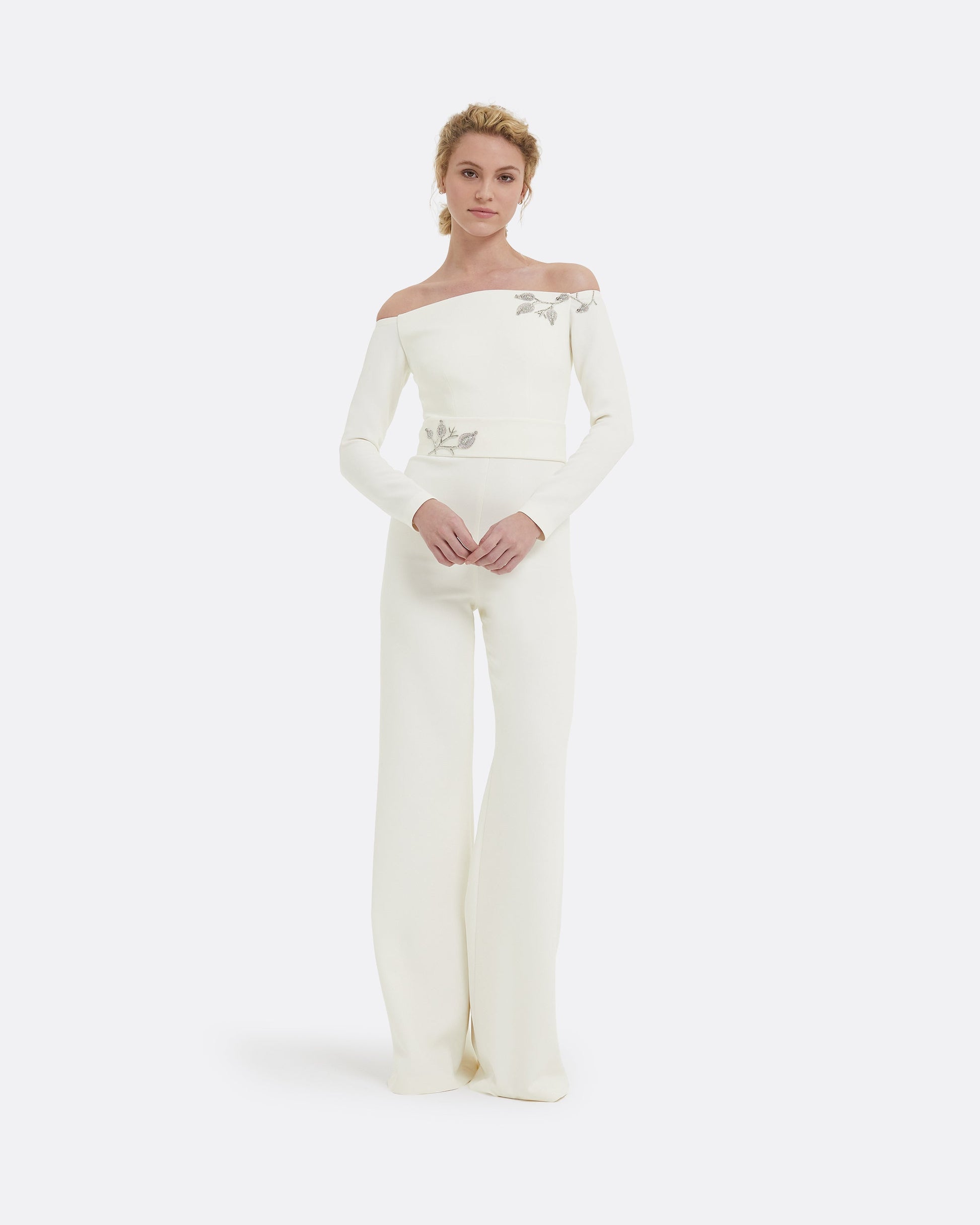 Long sleeved, off the shoulder, wide leg jumpsuit in ivory Heavy Crepe.