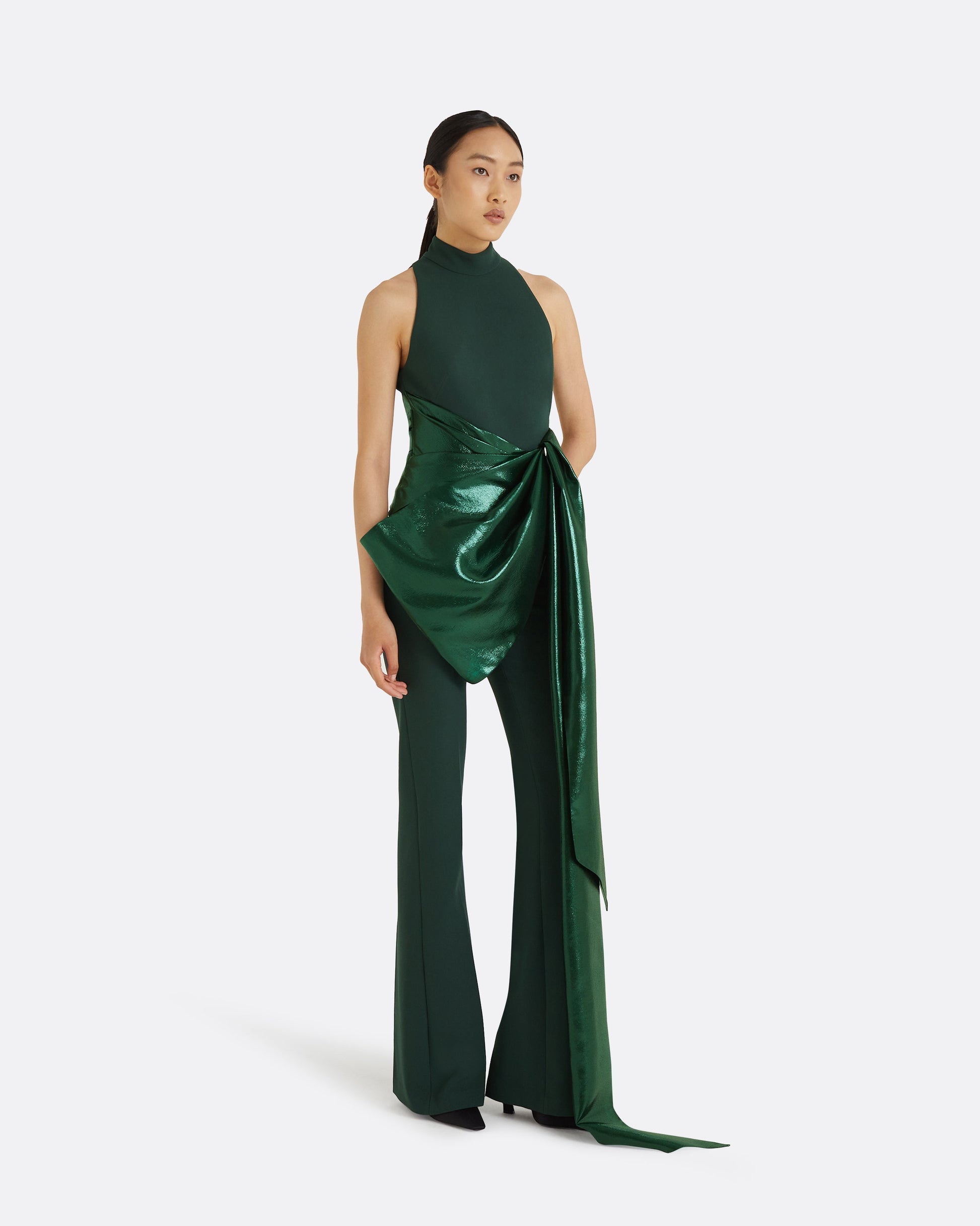 High neck jumpsuit with semi-flare leg and statement bow drape in darkest spruce Heavy Crepe and Metallic Organza.