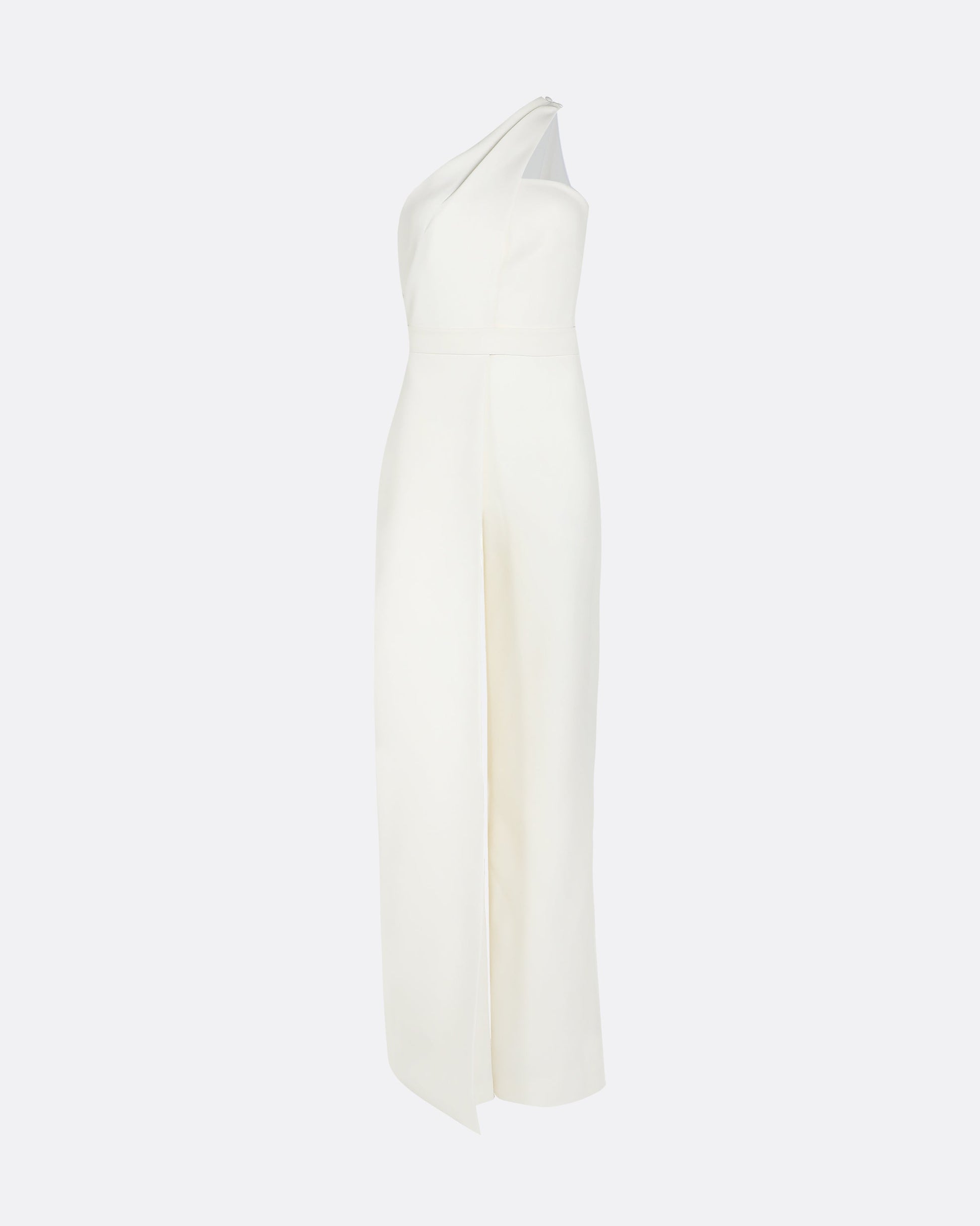 Flare leg jumpsuit with asymmetric overlay and twisted drape top in ivory. Item fully lined.