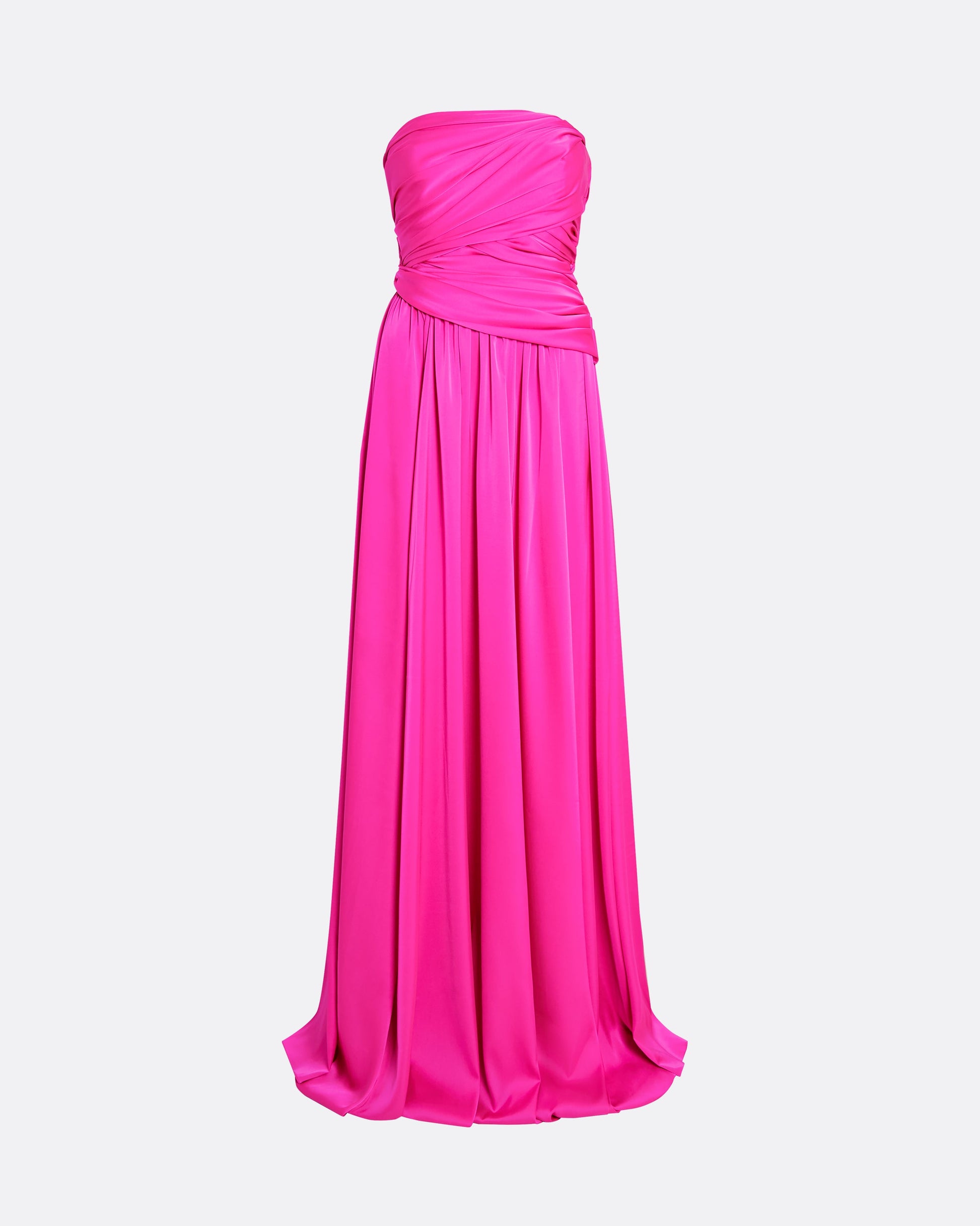 Bustier gown with pleated detail and full skirt and flowing floor length cape with neck tie detail in beverley Satin Chiffon.