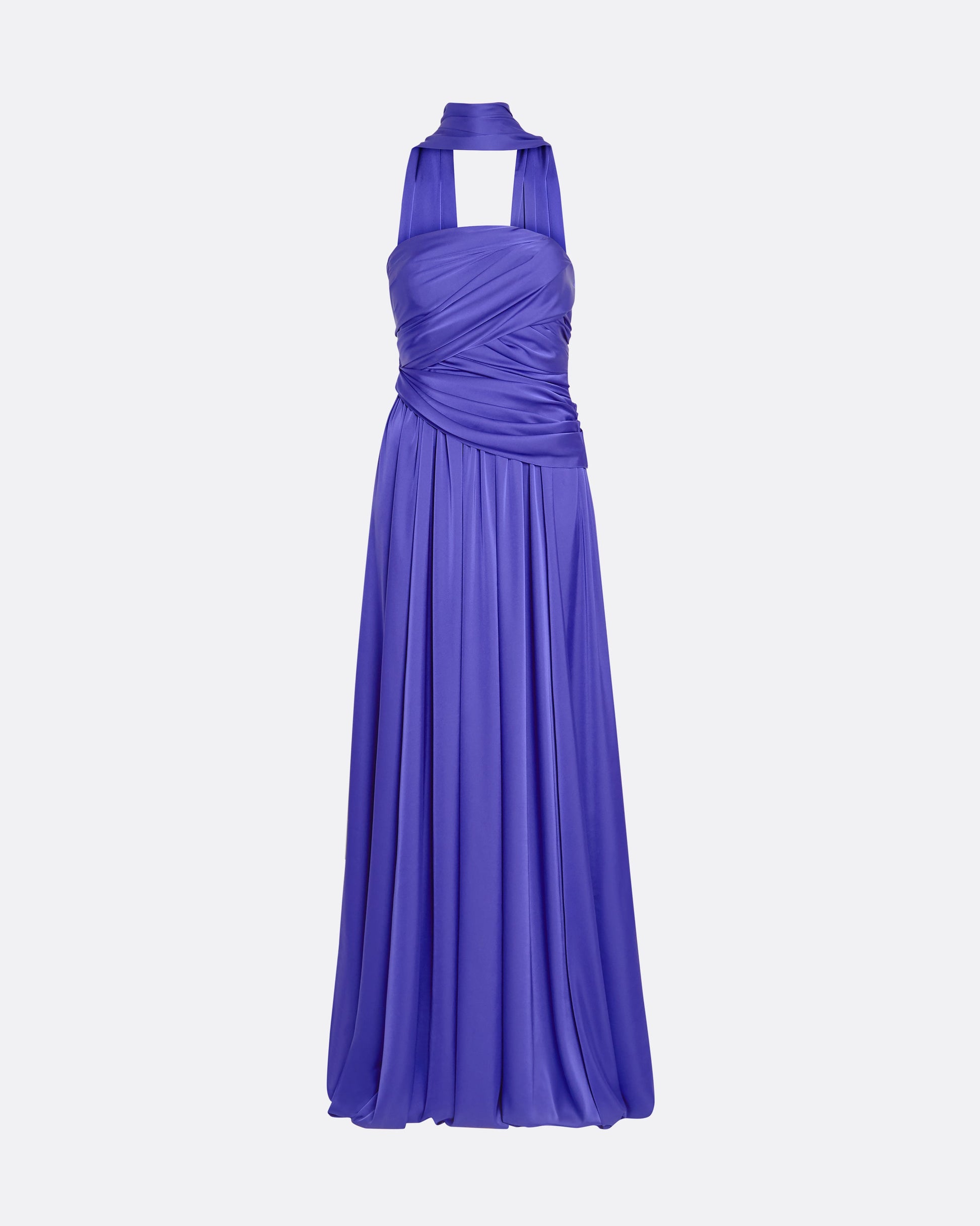 Bustier gown with pleated detail and full skirt with flowing scarf in spectrum Satin Chiffon.