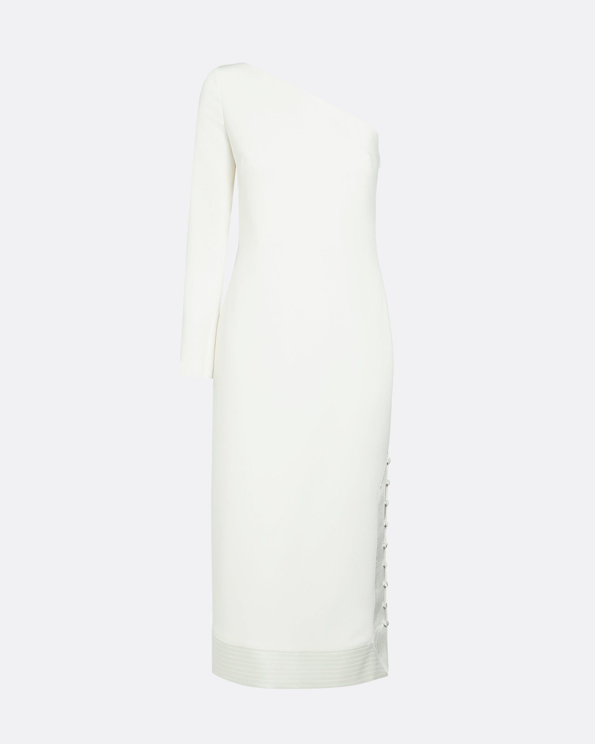A-line dress with panelled hem, side slit and cold shoulder sleeve in ivory Heavy Crepe and Shine Satin Stretch.