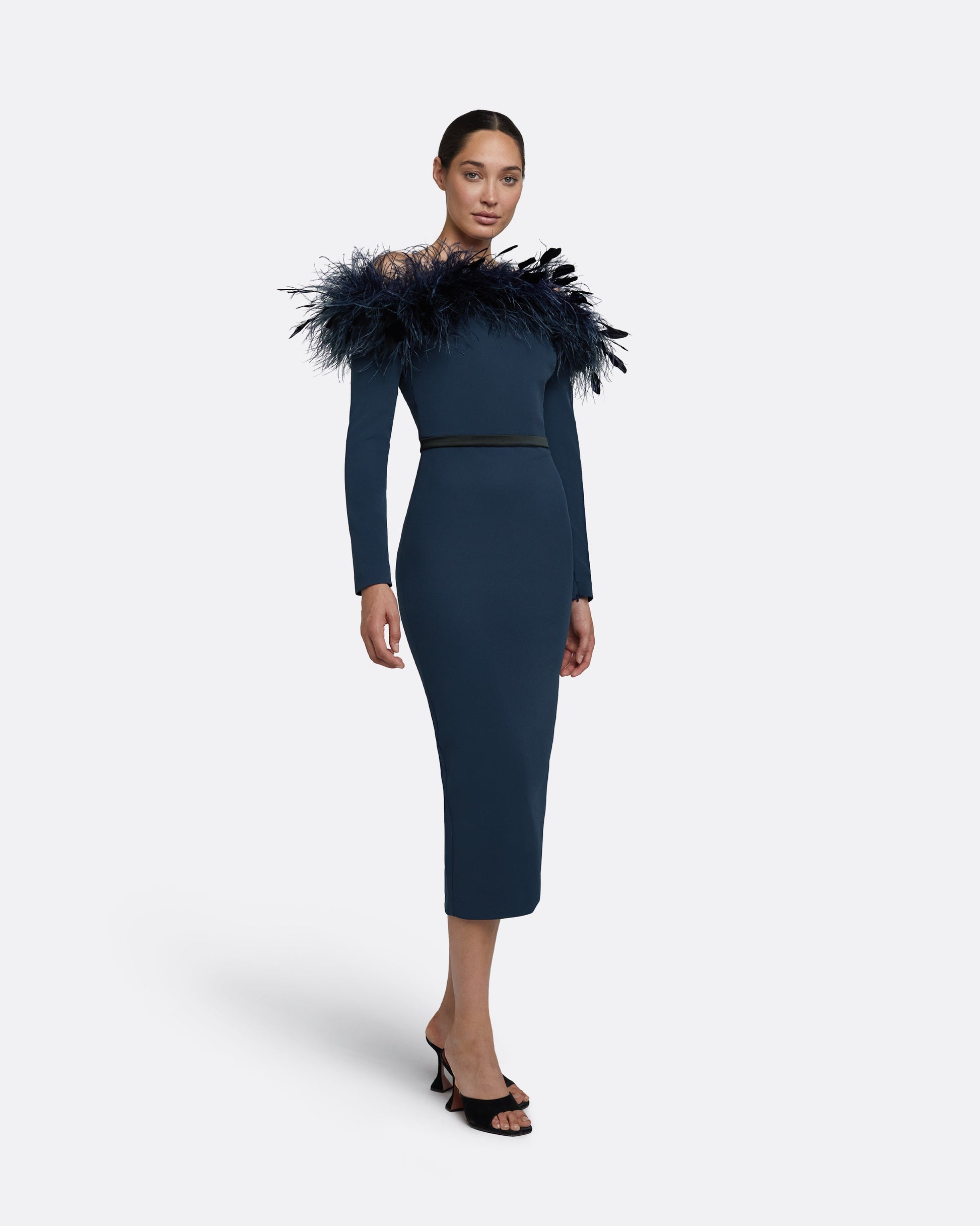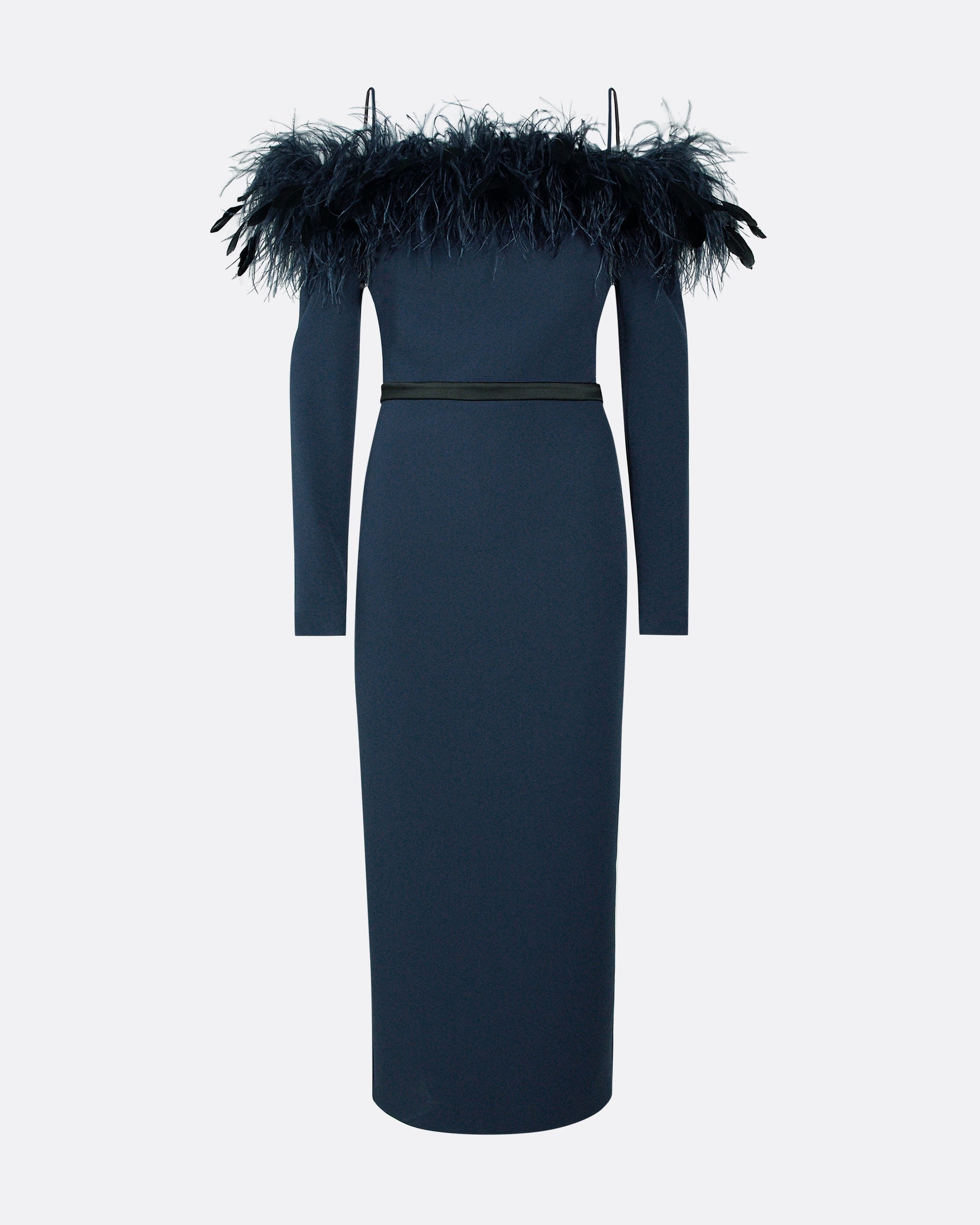 Vittoria Ink Blue Feather Trimmed Midi Dress