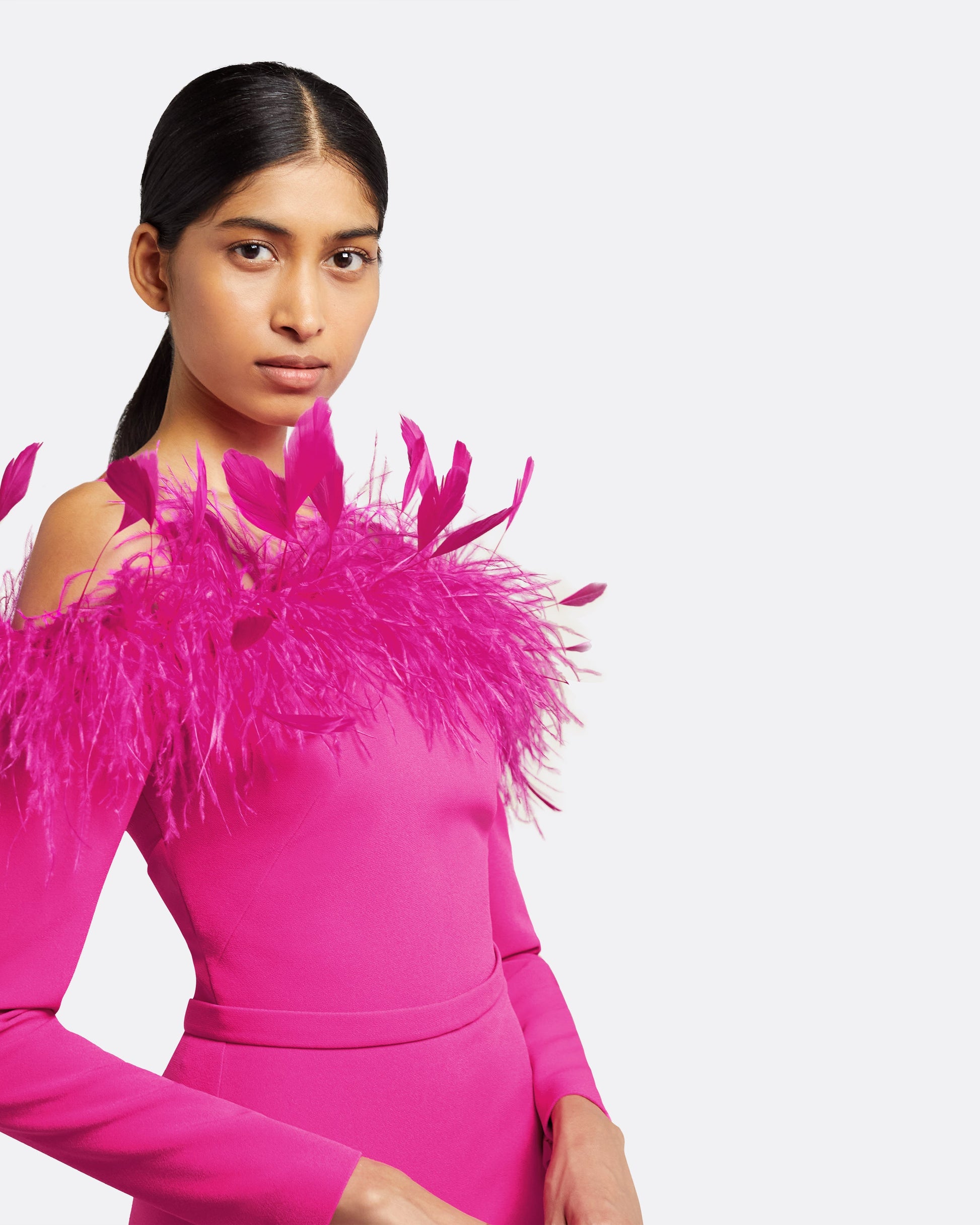Cocktail dress with squared neckline and back closure detail in wild strawberry Heavy Crepe and Duo Feathers embroidery.