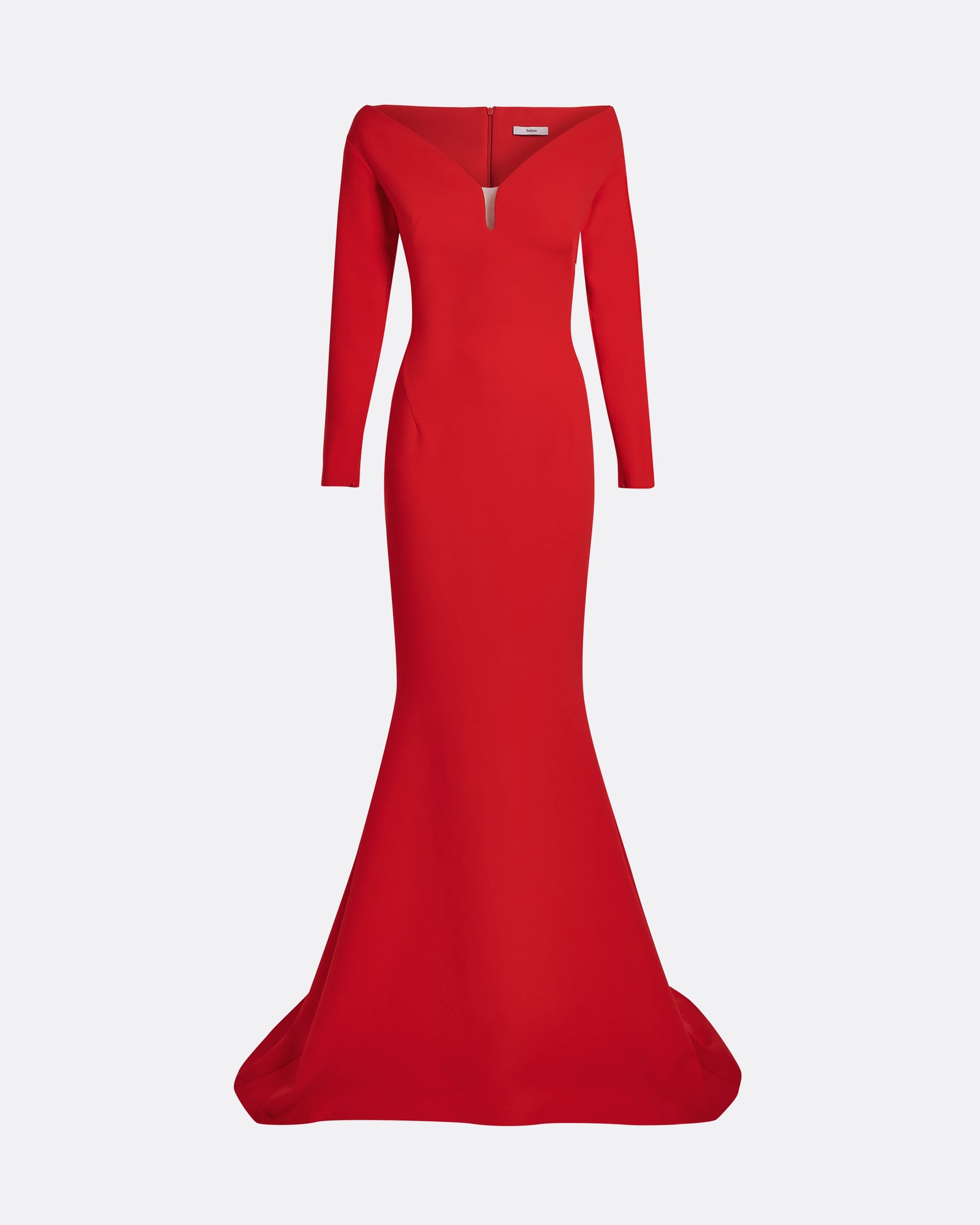Floor-length gown with modern, sweetheart neckline and fishtail skirt in cherry red Heavy Crepe.
