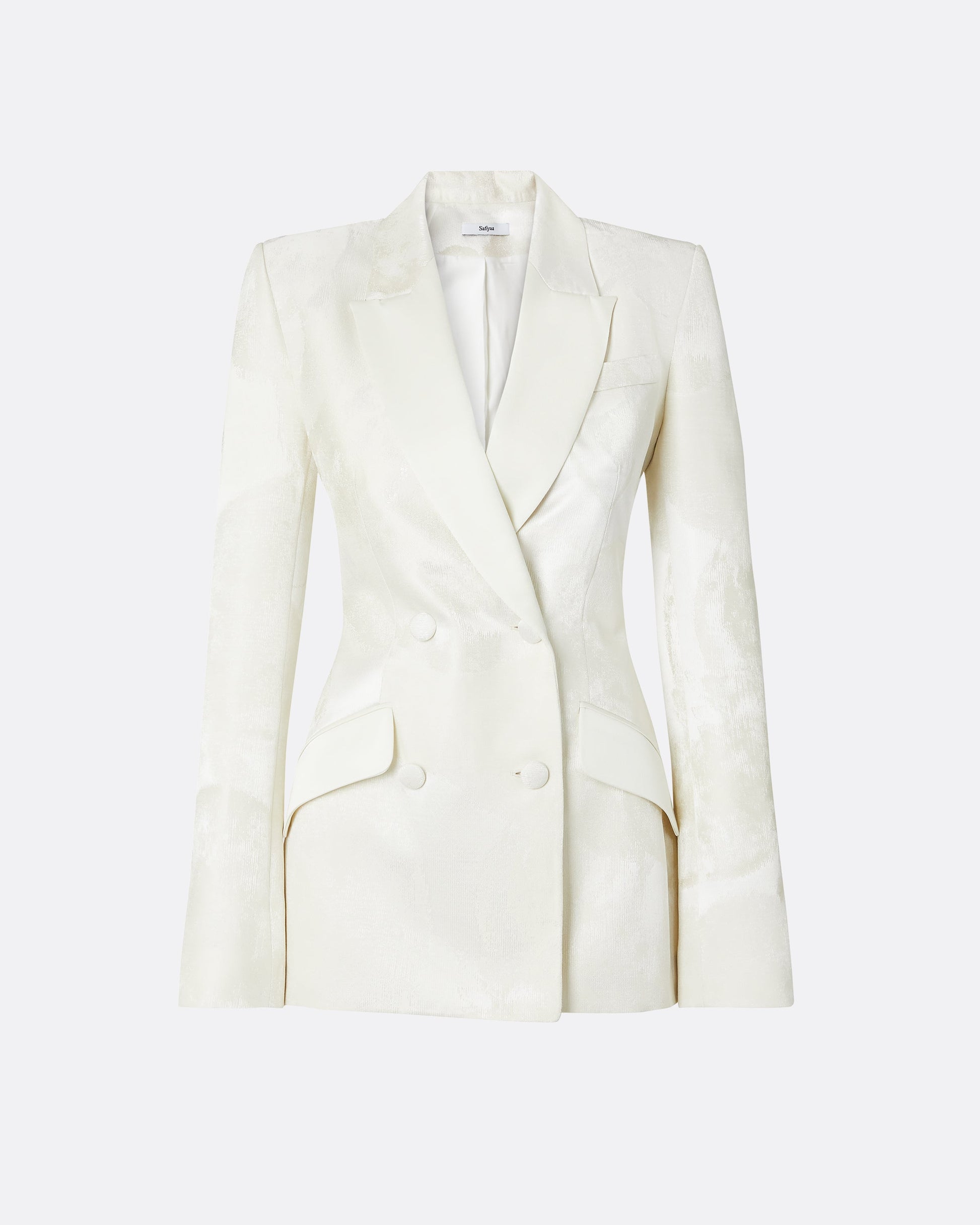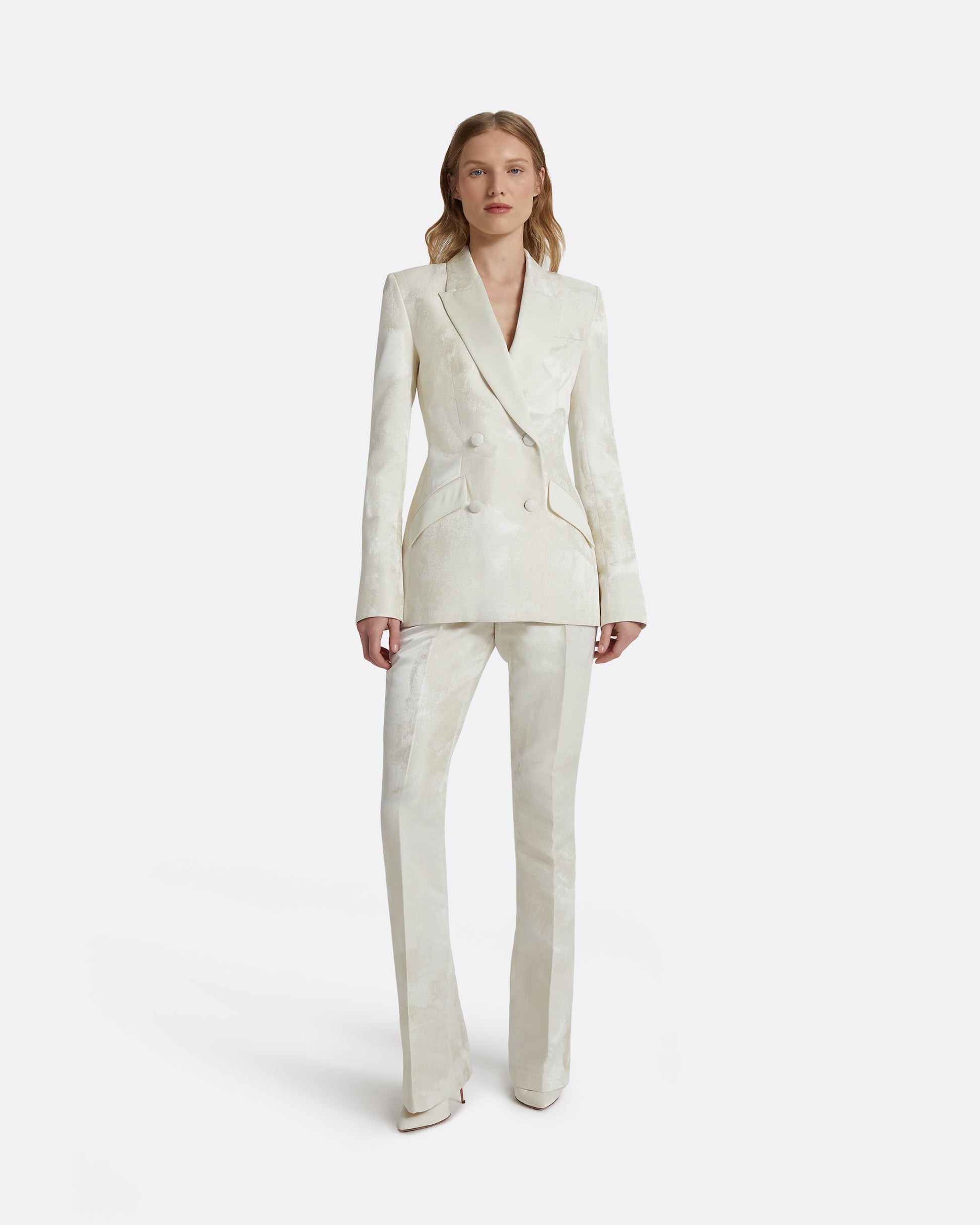 Classic tuxedo style jacket with tailored shoulder in ivory Opal Jacquard.
