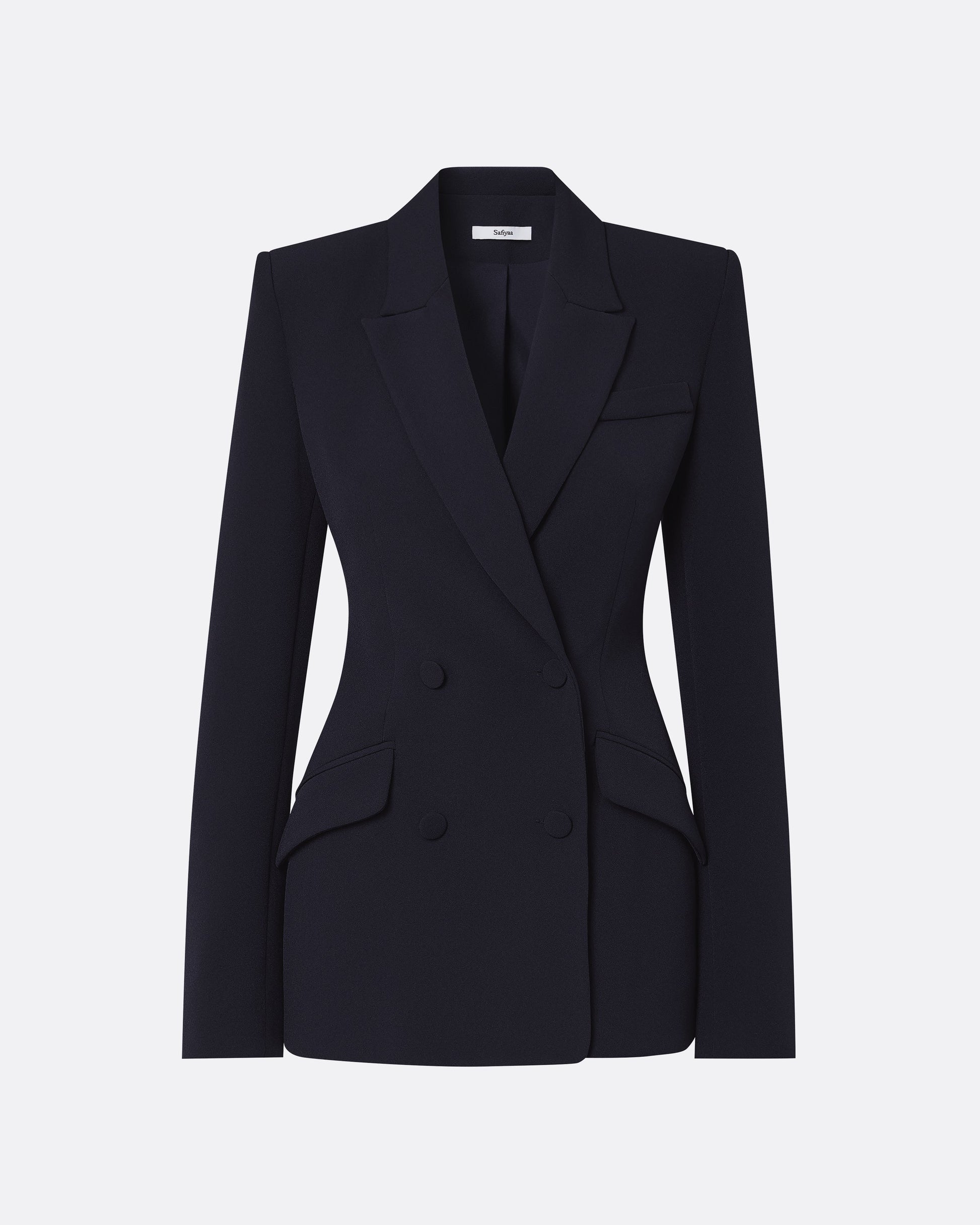 Classic tuxedo style jacket with tailored shoulders in midnight navy Heavy Crepe.