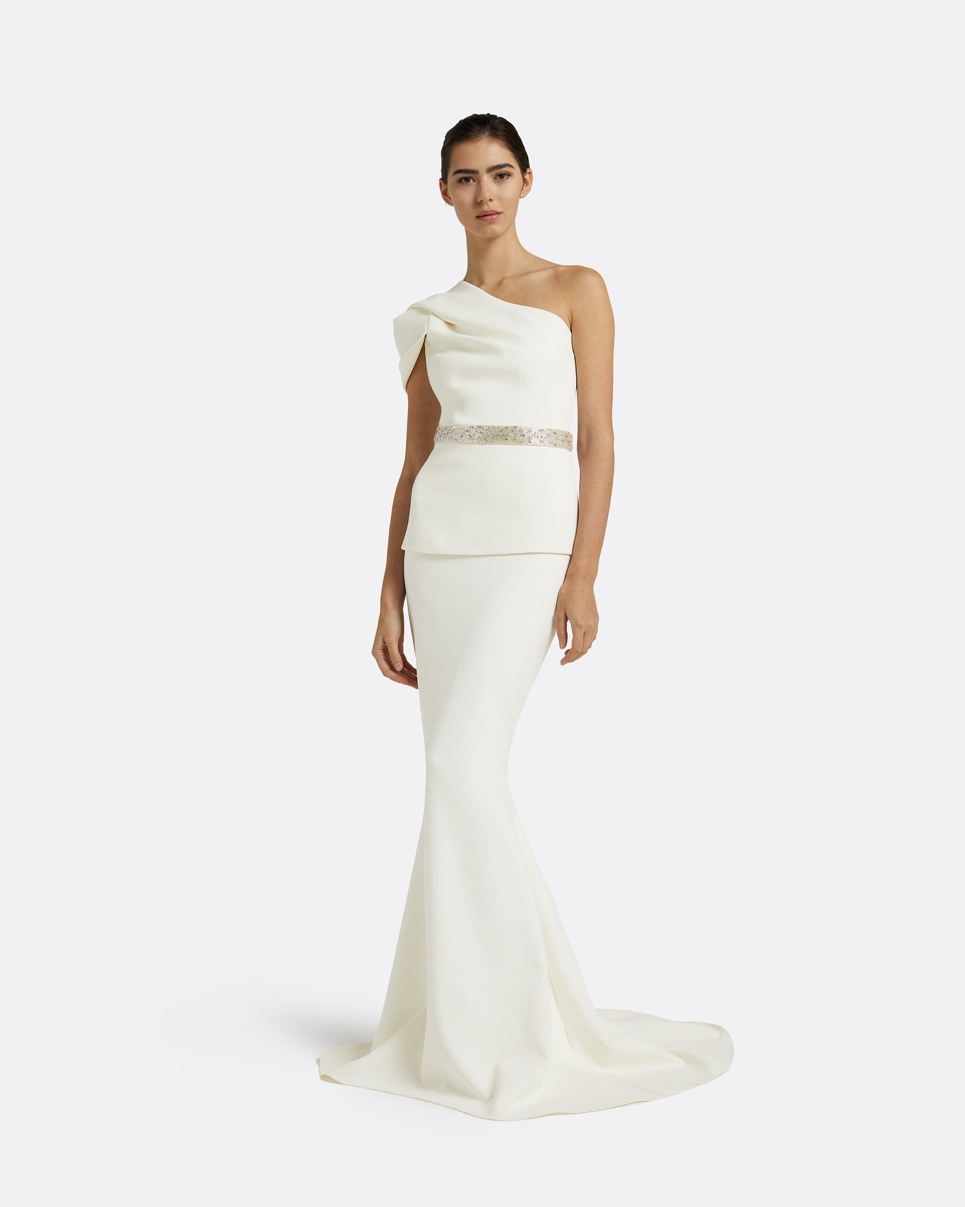 Intricate draped sleeved top with asymmetric neckline in ivory.