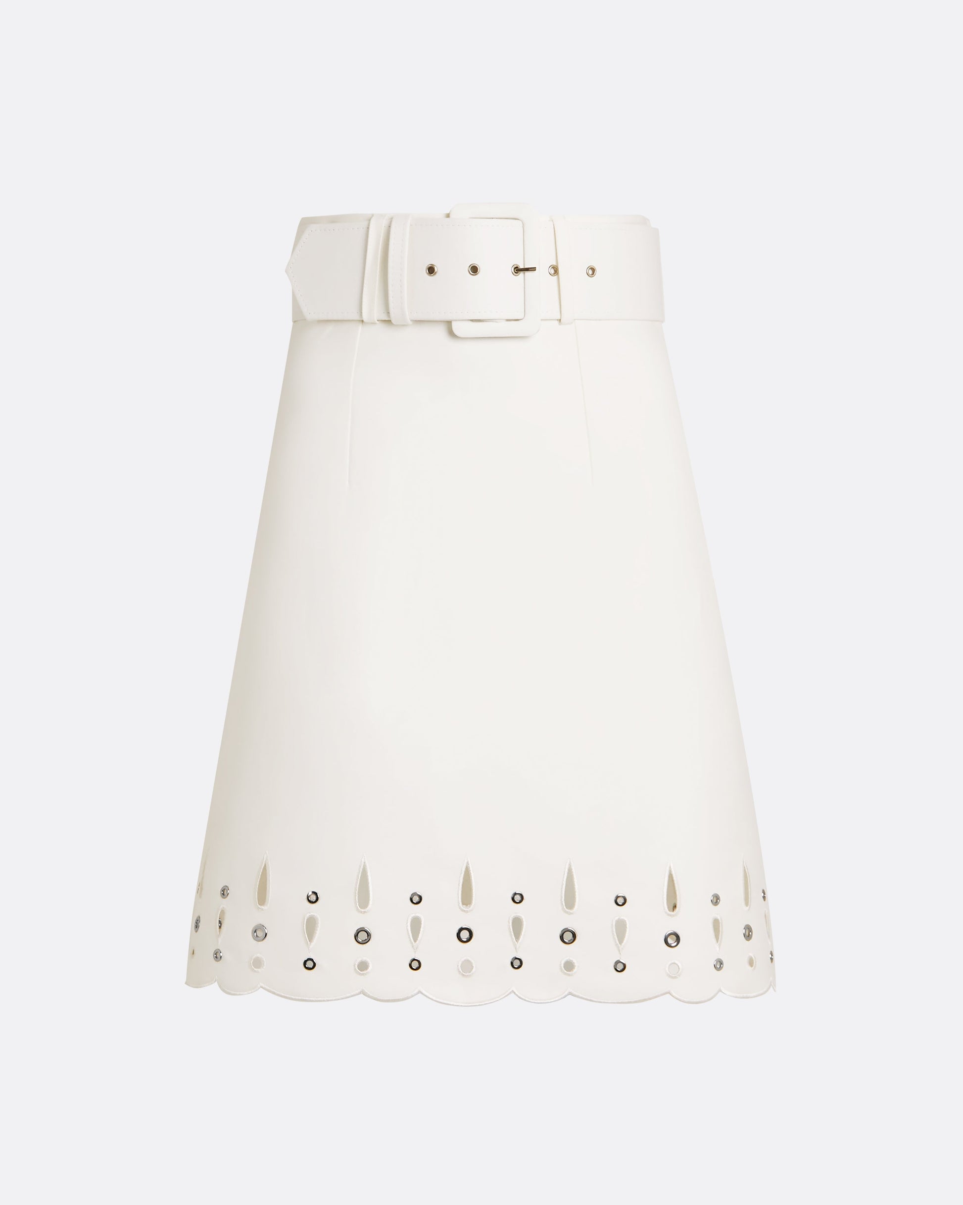 High waisted A-line skirt in ivory Cotton Drill with silver Anglaise embroidery.