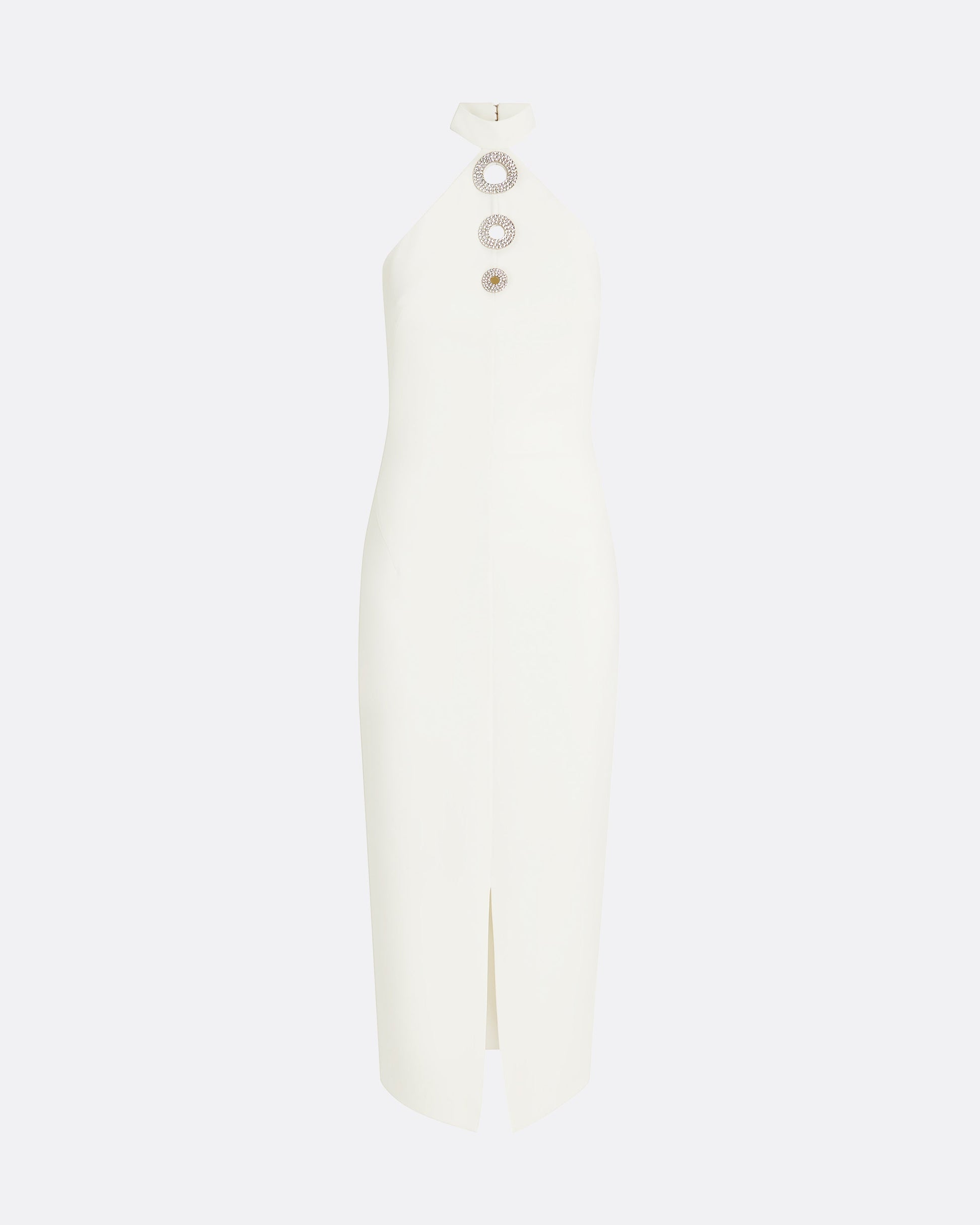 Collared cocktail dress with front slit and halterneck in ivory Heavy Crepe with crystal Deco Ring embroidery.