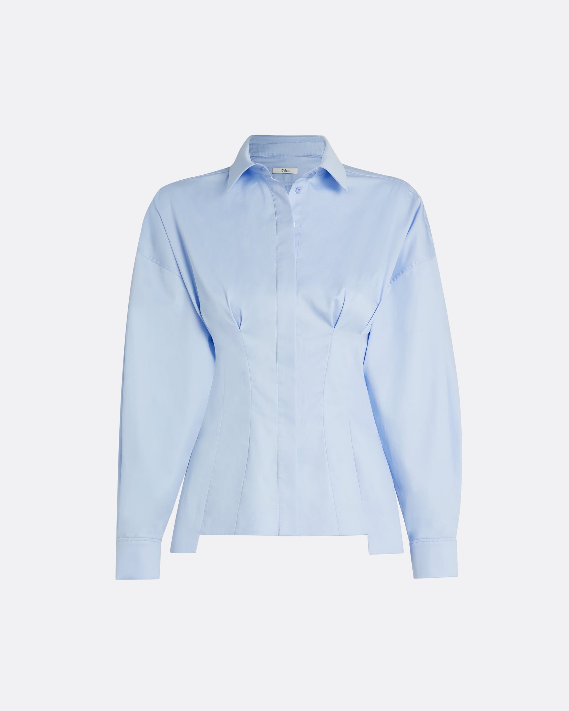 Statement shirt with elegant V-neck line and classic top stitch details in pale blue Cotton Poplin.